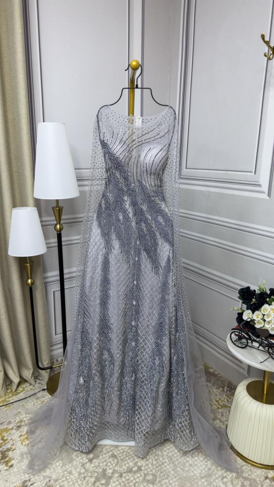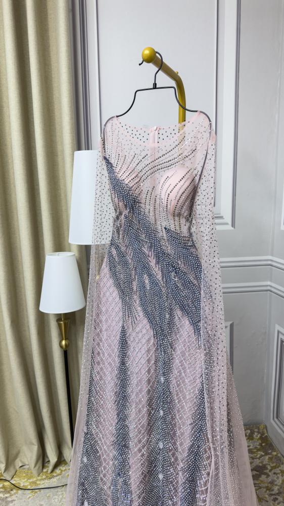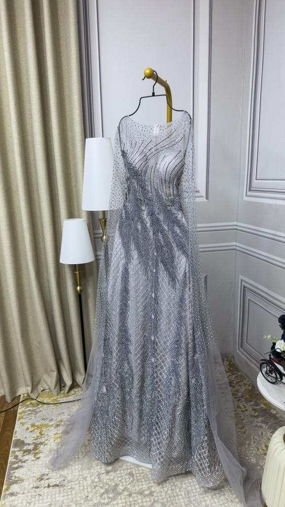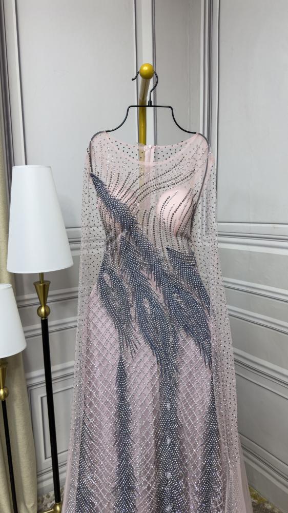 فستان سهره الالوان زهري و رمادي القماش تل أصلي مطرز كمبيوتر وفصوص أكمام طويله بطانه كريب لكرا ناعم AR