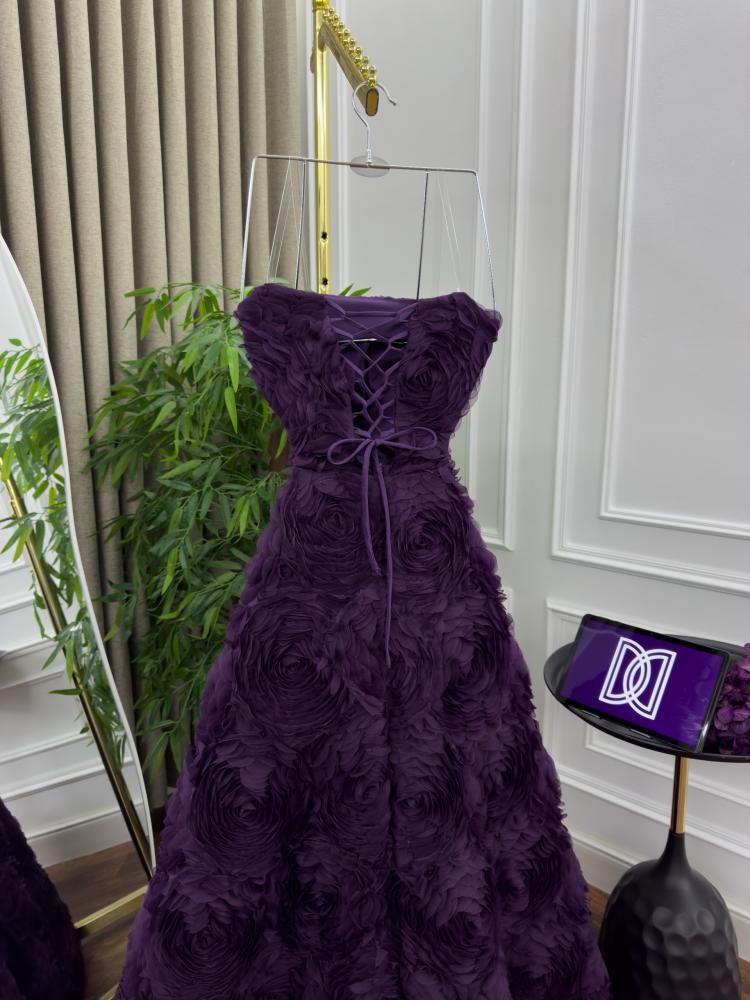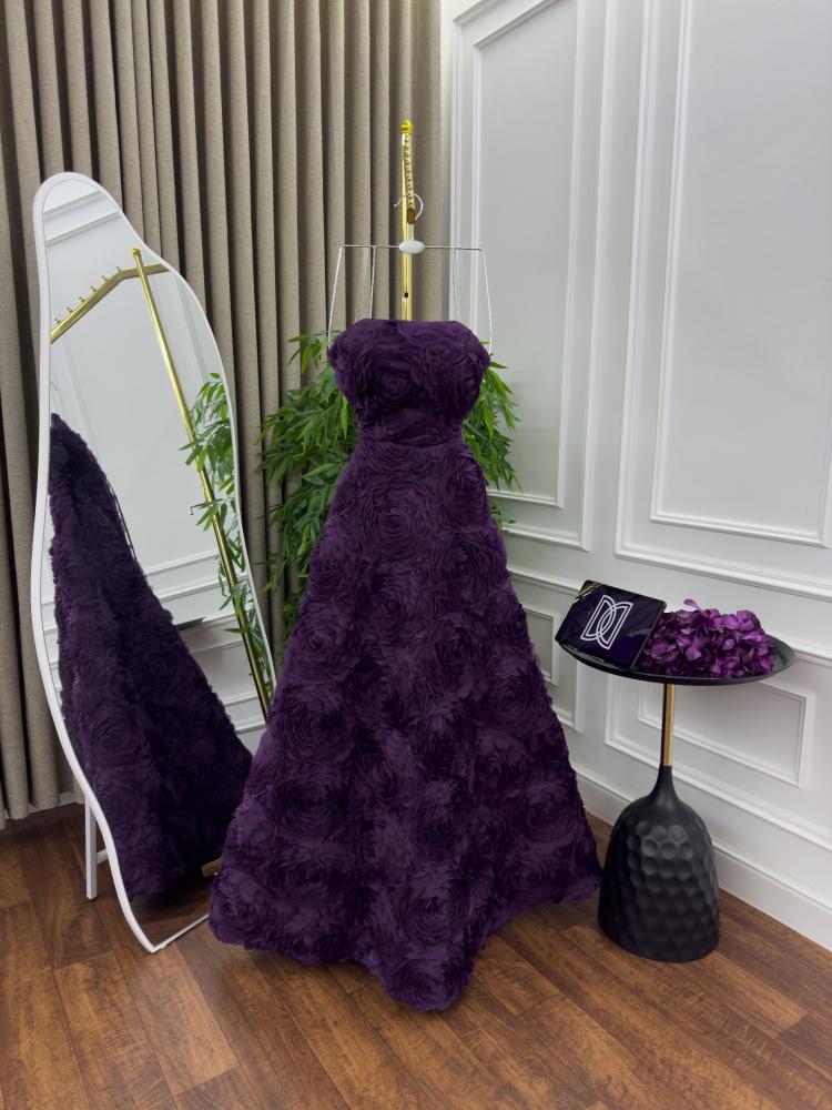 فستان سهره اللون بنفسج ورود بارزه وكلوش وجيبون تحت D