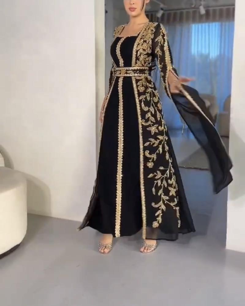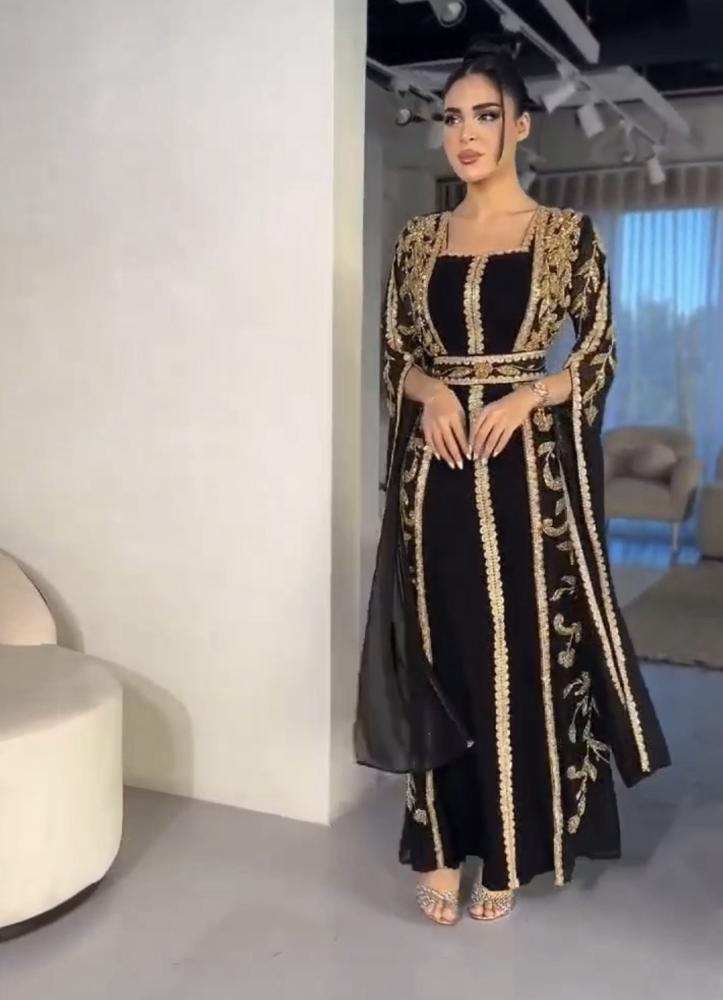 جلابيه فخمه و أنيقه مكونه من قطعتين من الداخل باربي و معطف من الشيفون المطرز تطريز يدوي باللون الذهبي ليعطيك إطلاله مميزه اللون اسود و ذهبيالخامه باربي و شيفون غير قابل للتمددالمناسبه : كولكشن رمضان -مناسبه خاصه-كولكشن العيد