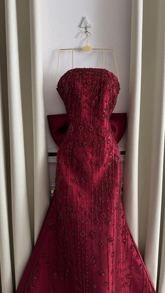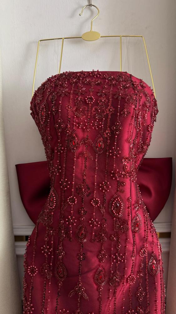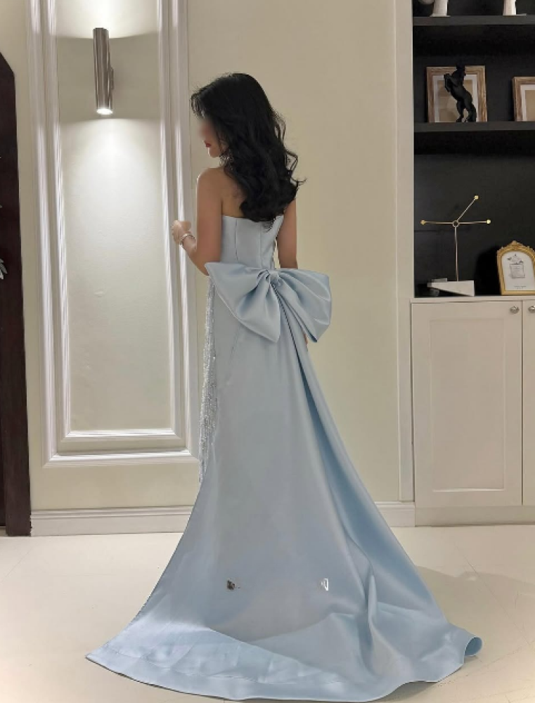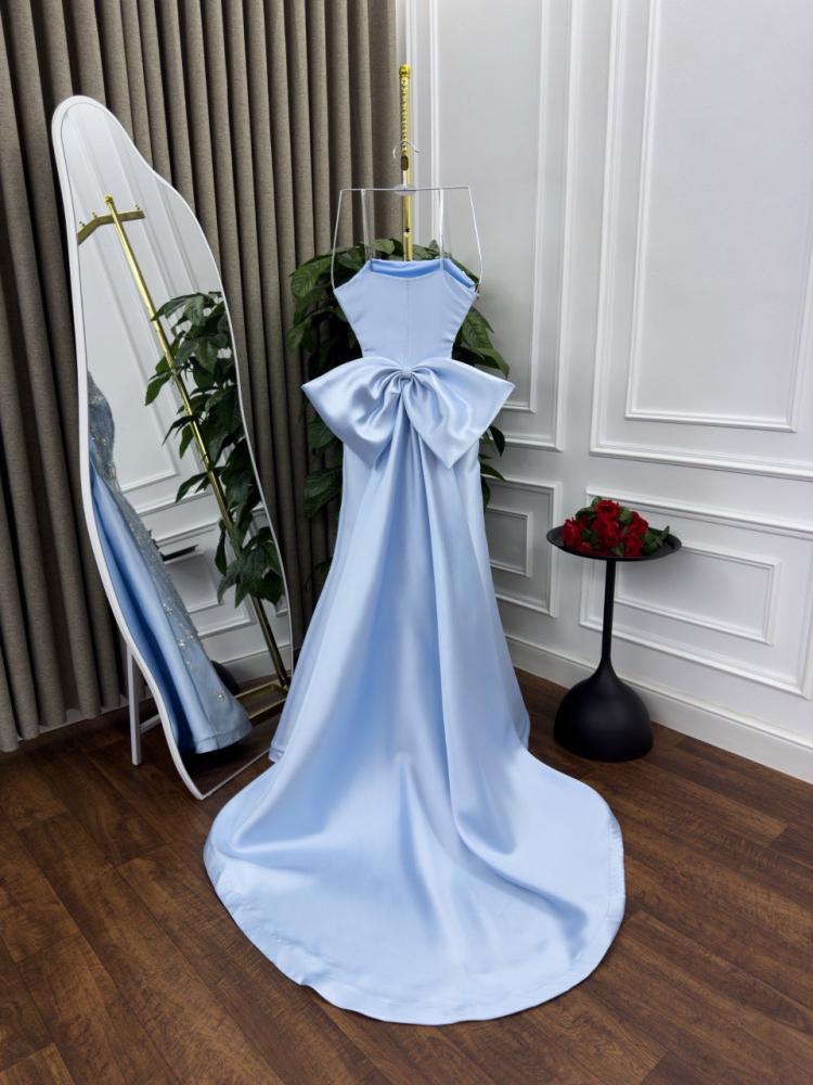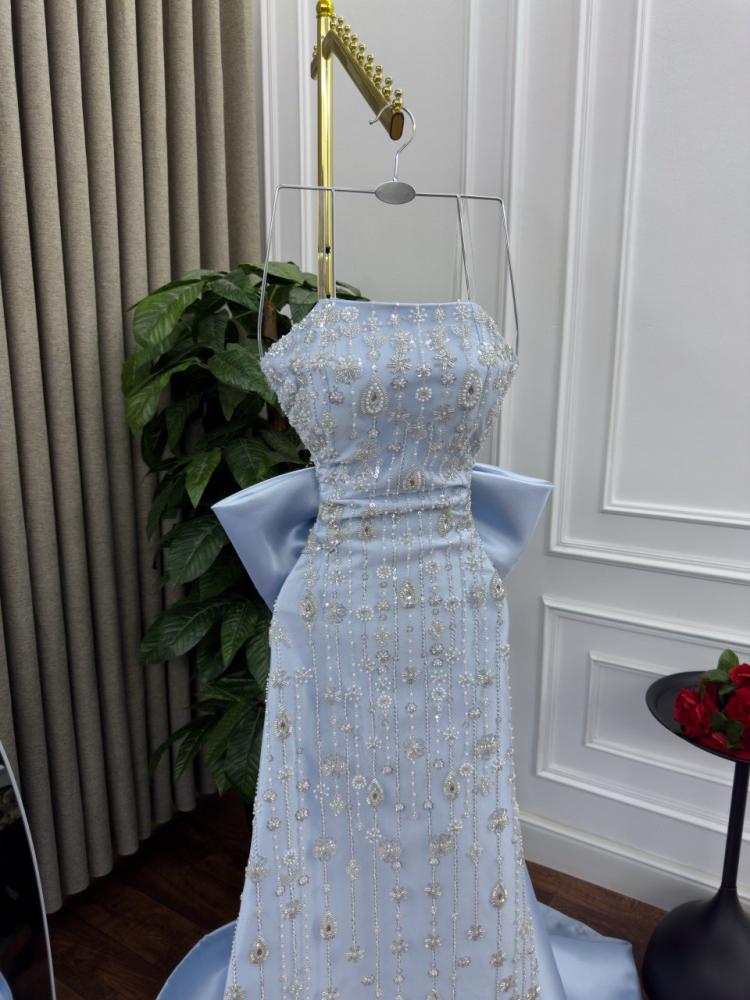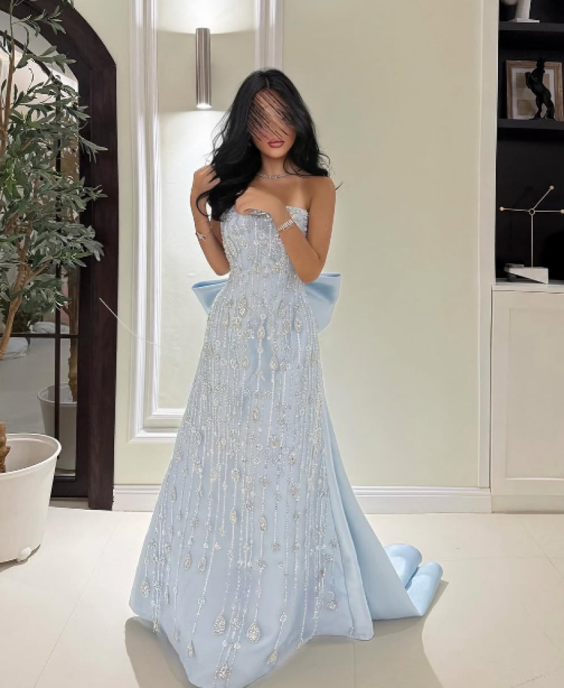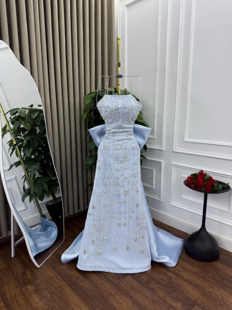فستان سهره اللون سماوي خامه ميكادو وكلفه خرز من متجر جوهره MN