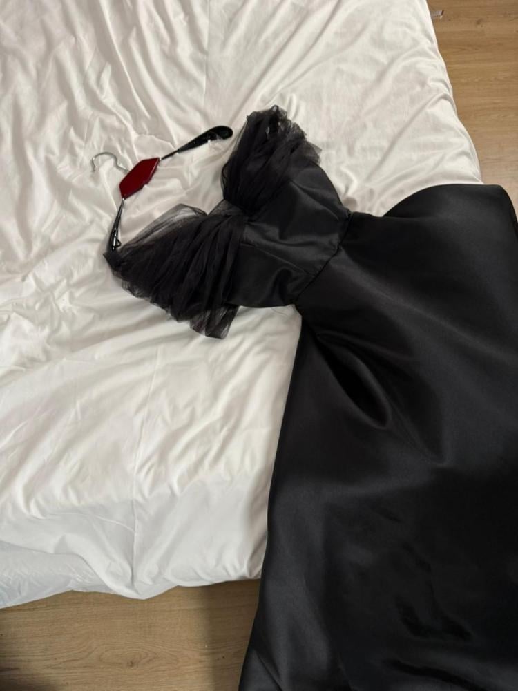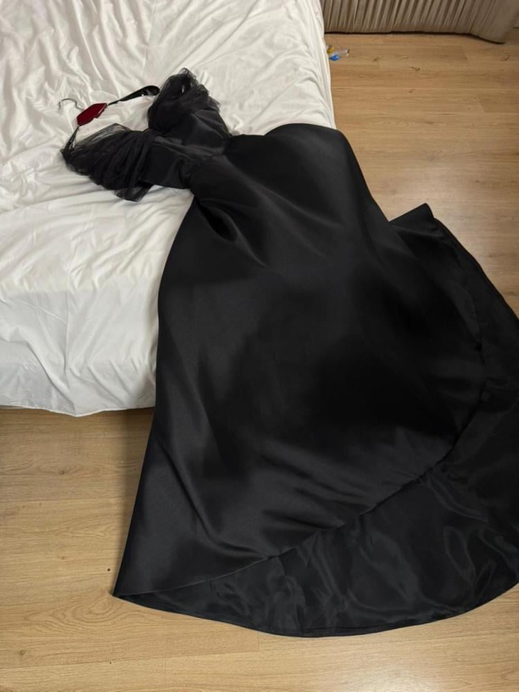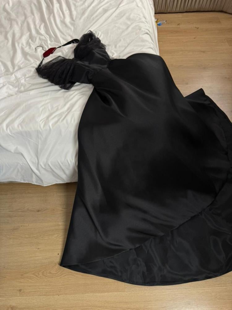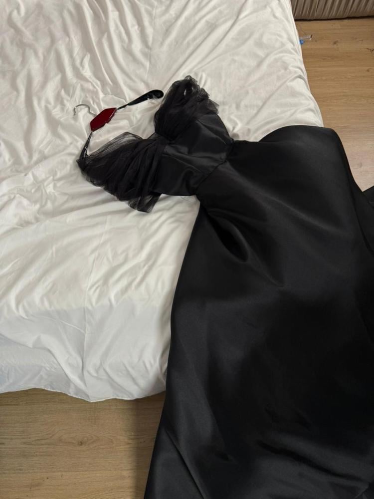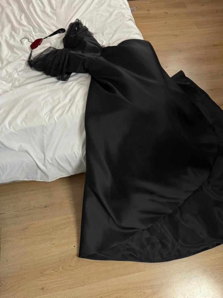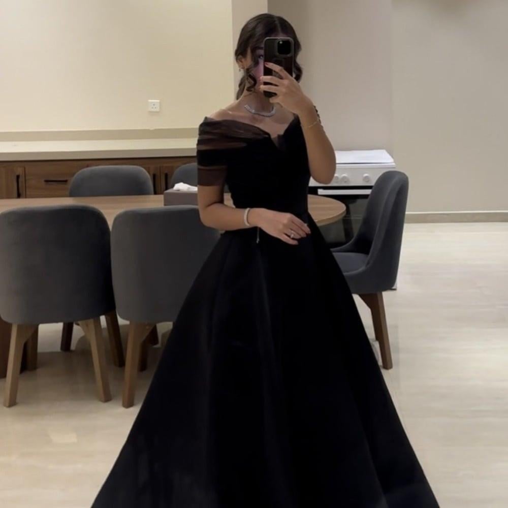 فستان سهره اللون اسود ميكادو الاصلي سادة كلوش معا ذيل مبطن جيبون سهرات سلك كامل تل ناعم صدر من متجر جوهره AT