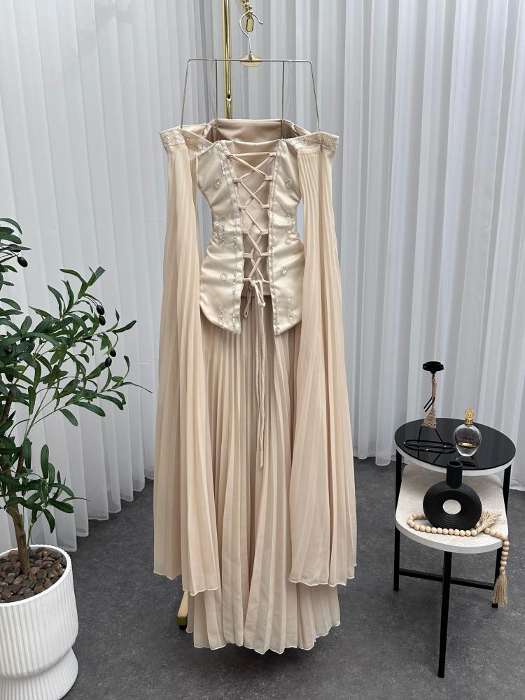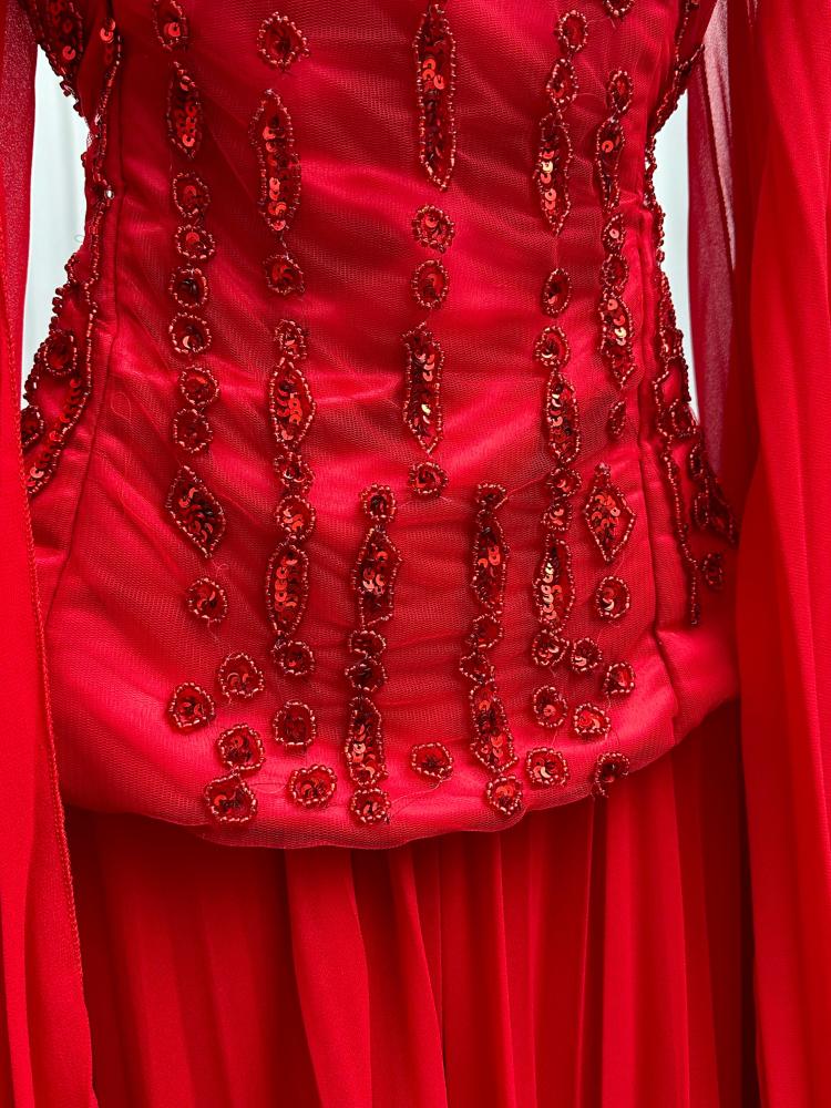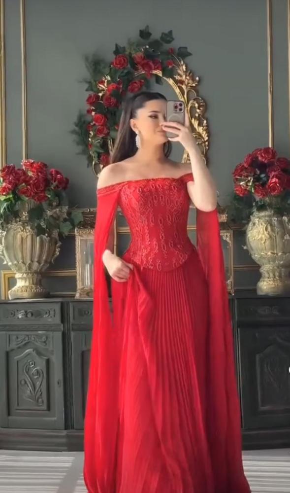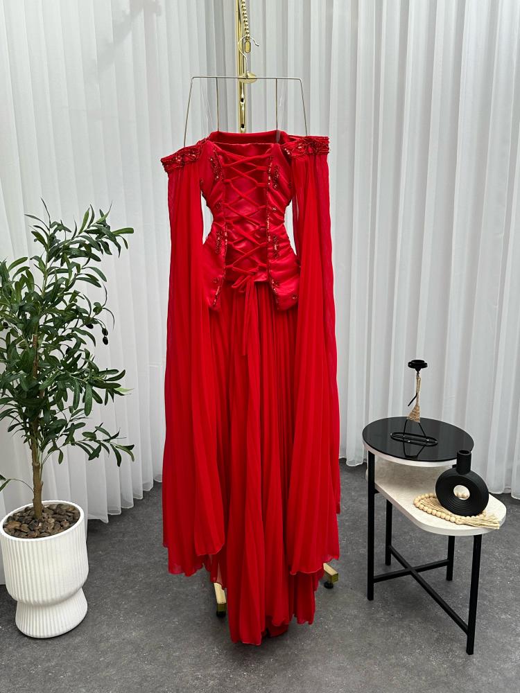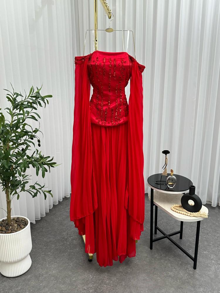 فستان سهره اللي فوق تفته مطرز يدوي خرز اللي تحت والكمام جورجيت بوليسيه بطانه ناعمه الالوان بيج و احمر NW