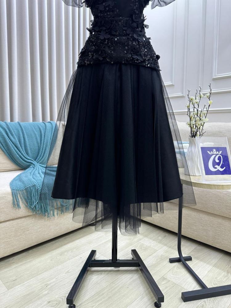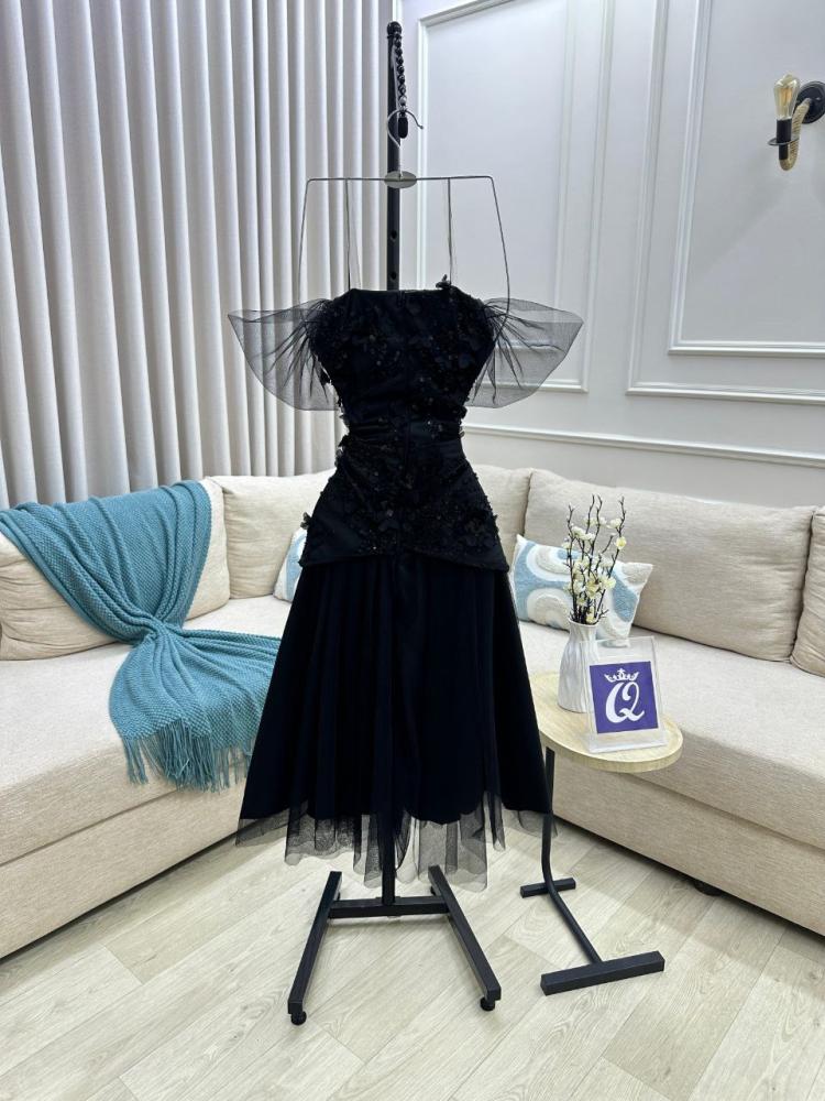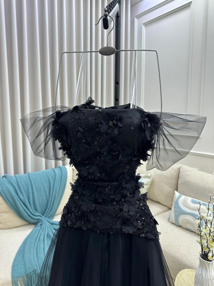 فستان سهره اللون اسود ميد اسود وخرز و ورد على تل تايواني وتفته استرتش من متجر جوهره QU