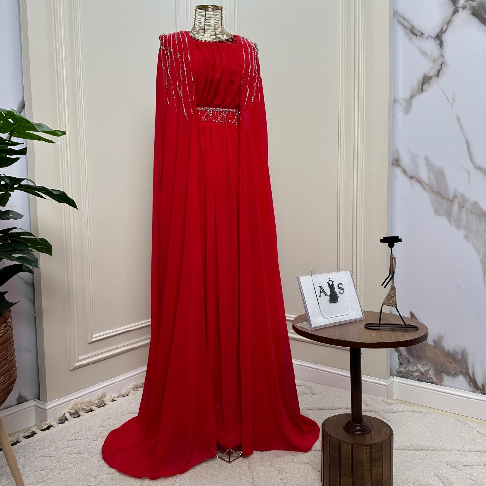 فستان احمر شيفون جورجيت مزين بالكريستال