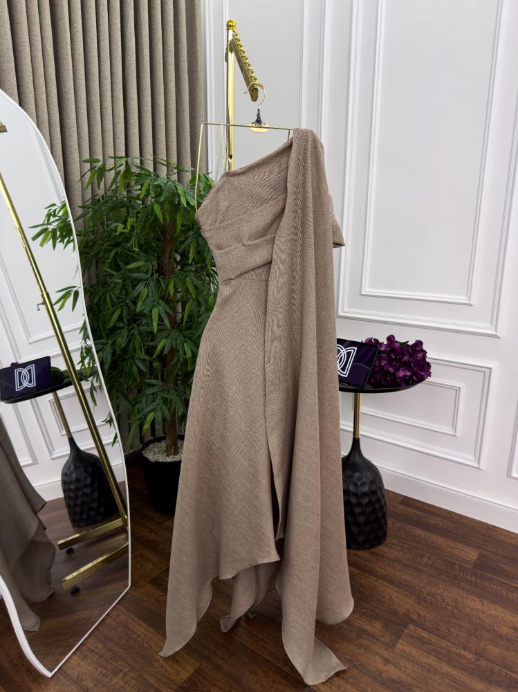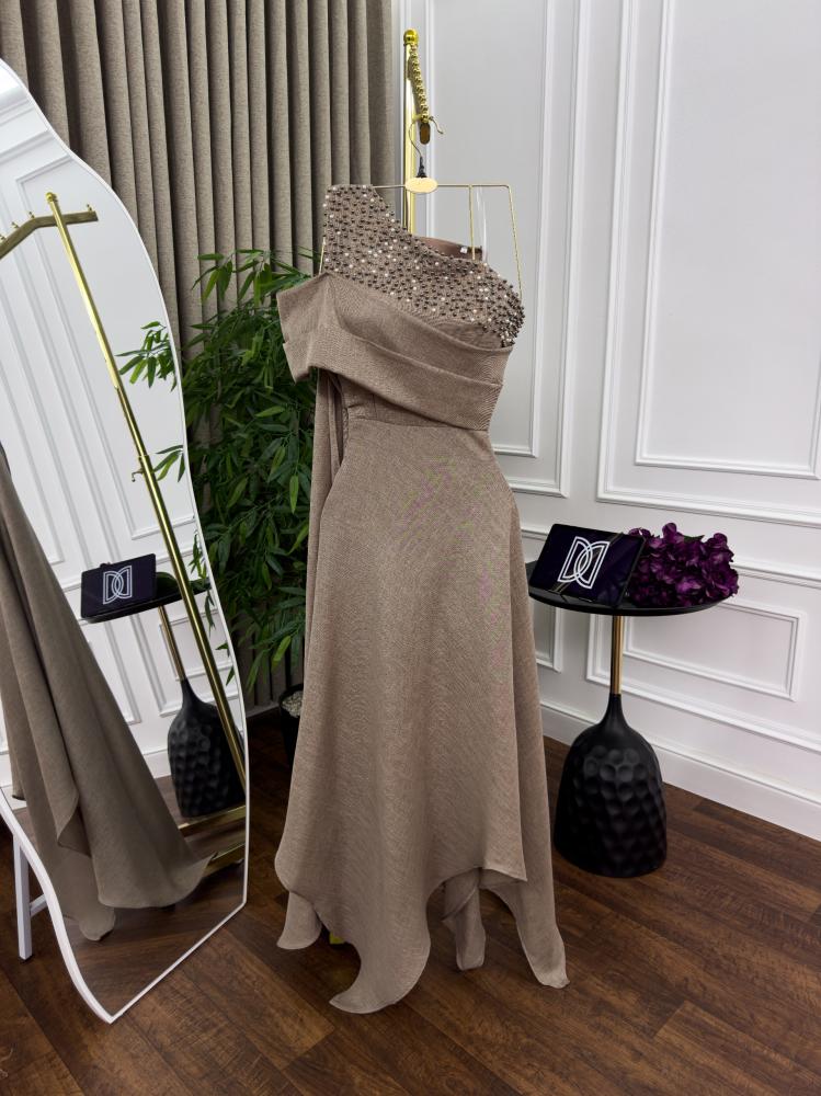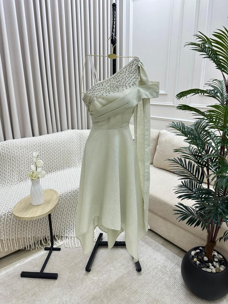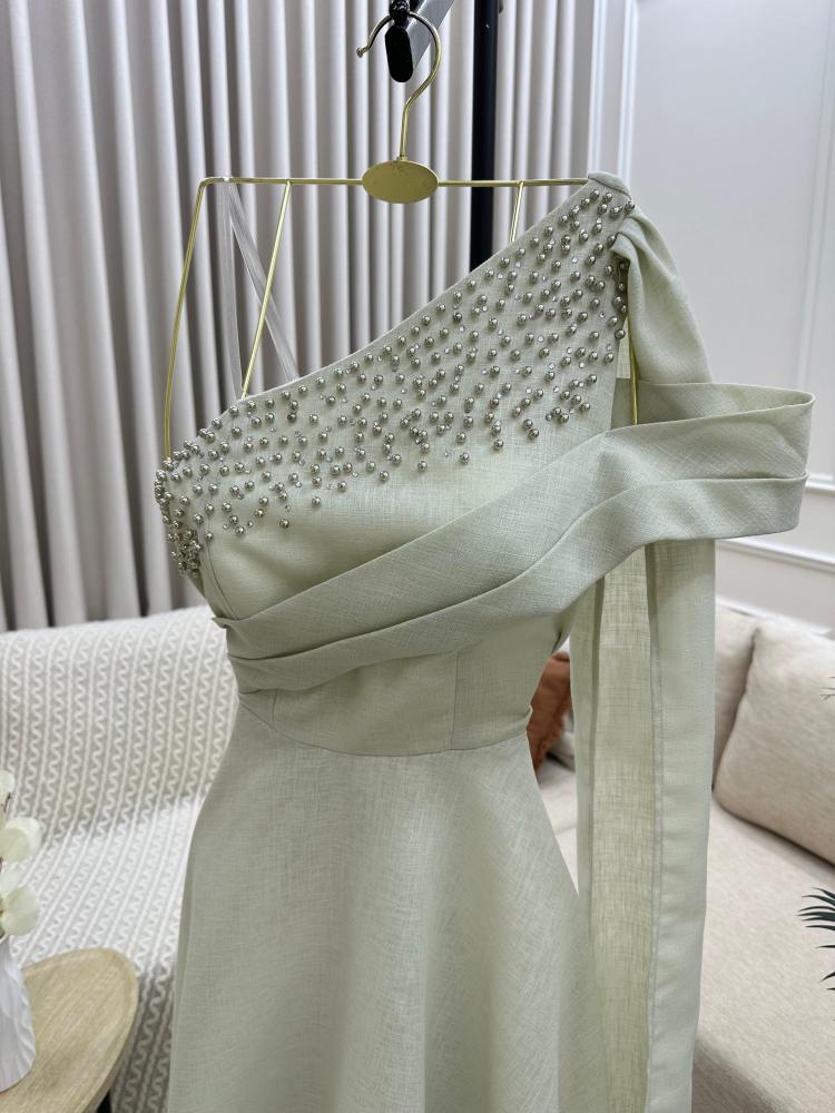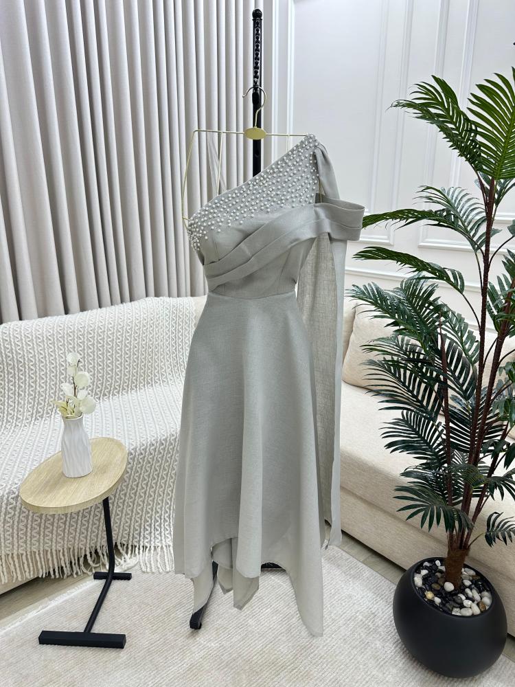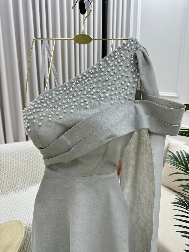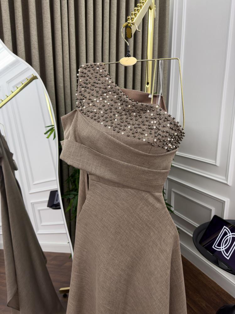 فستان لينن و كتان سكري و رمادي و بني مزين باللولو و الخرز من متجر جوهره