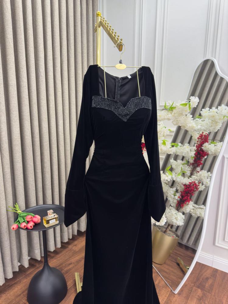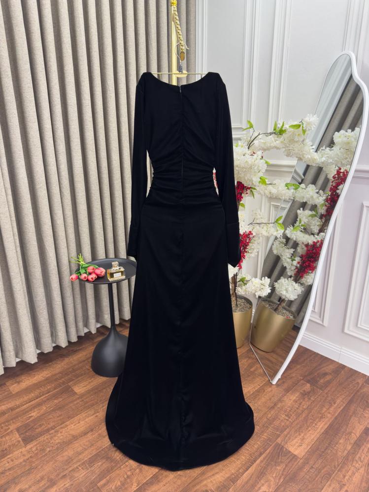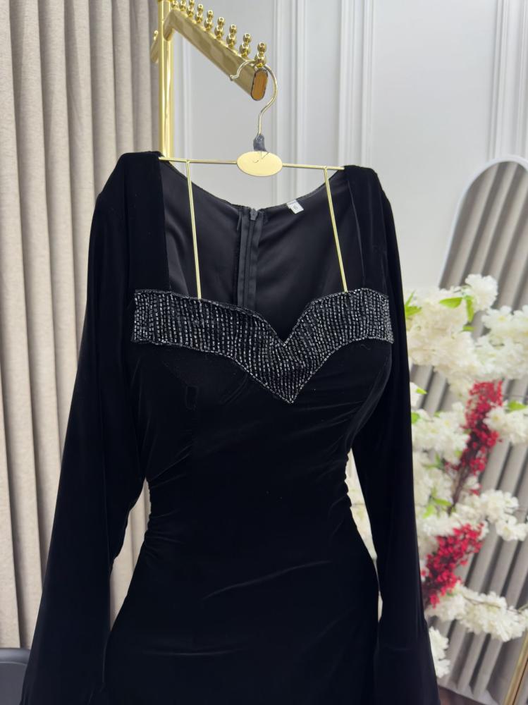 فستان ماكسي اسود جوخ مزين بالفصوص