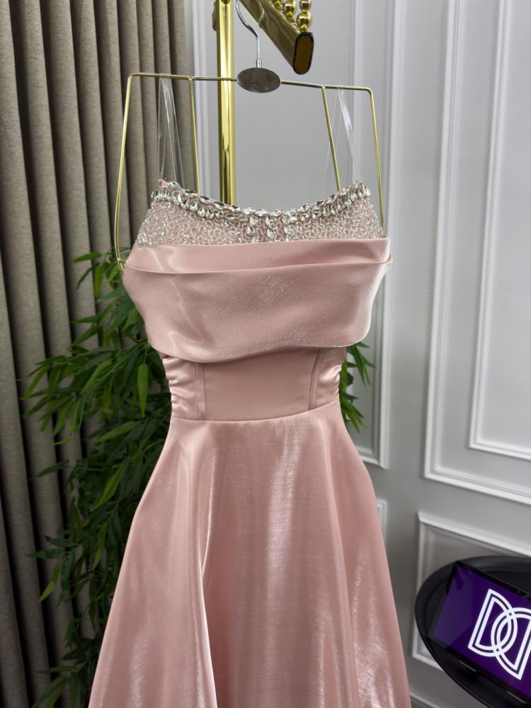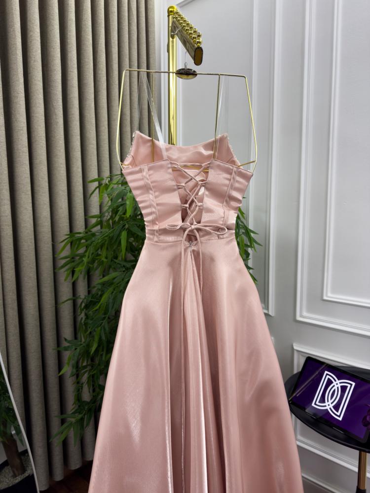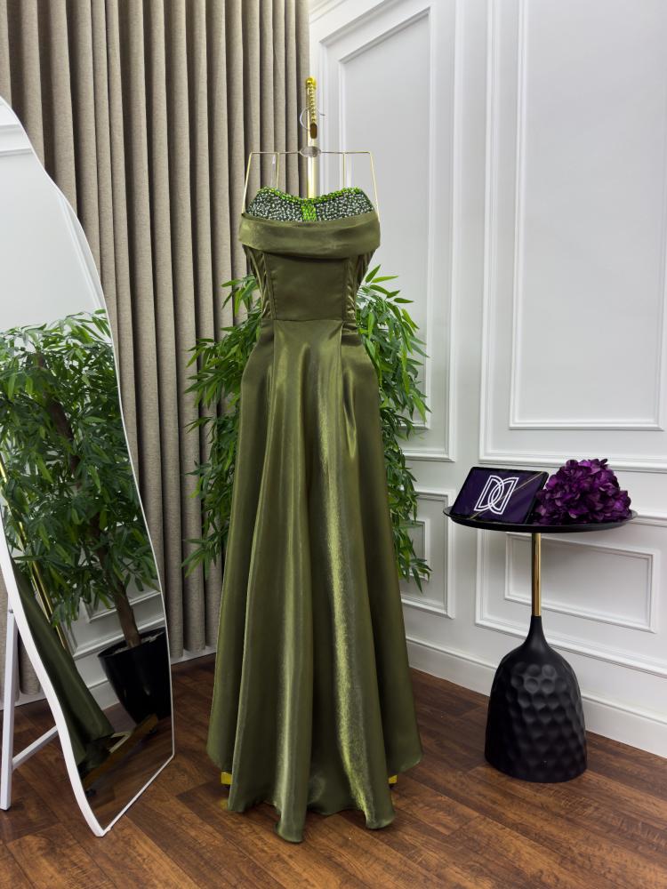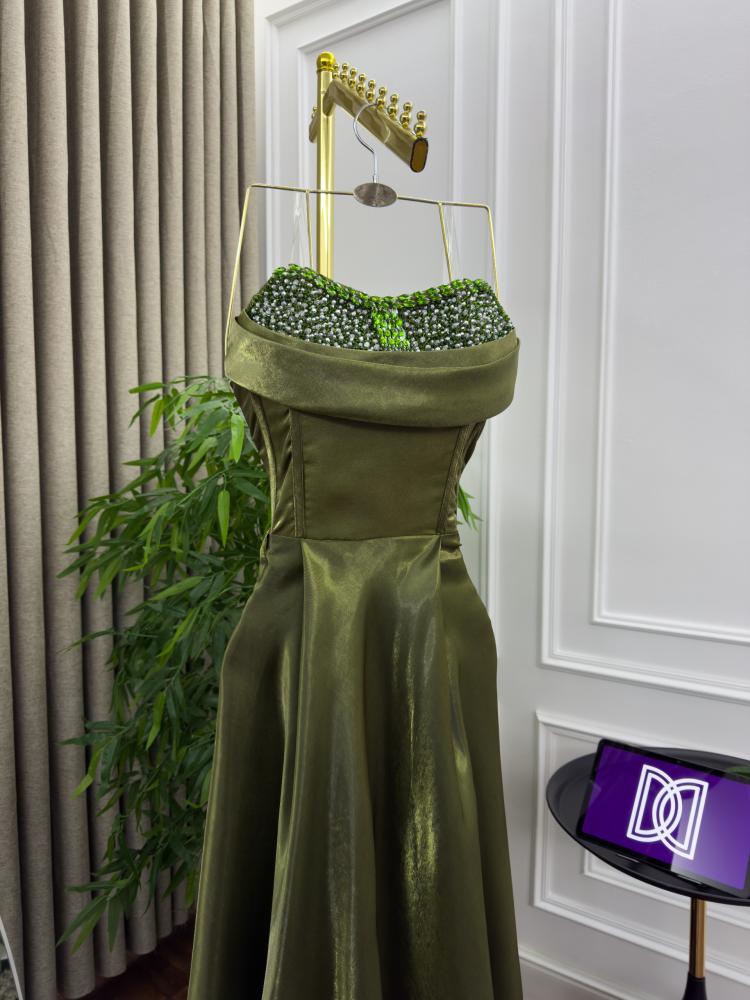 فستان ناعم زيتي و لحمي وردي ميكادو لمعه تطريز يدوي
