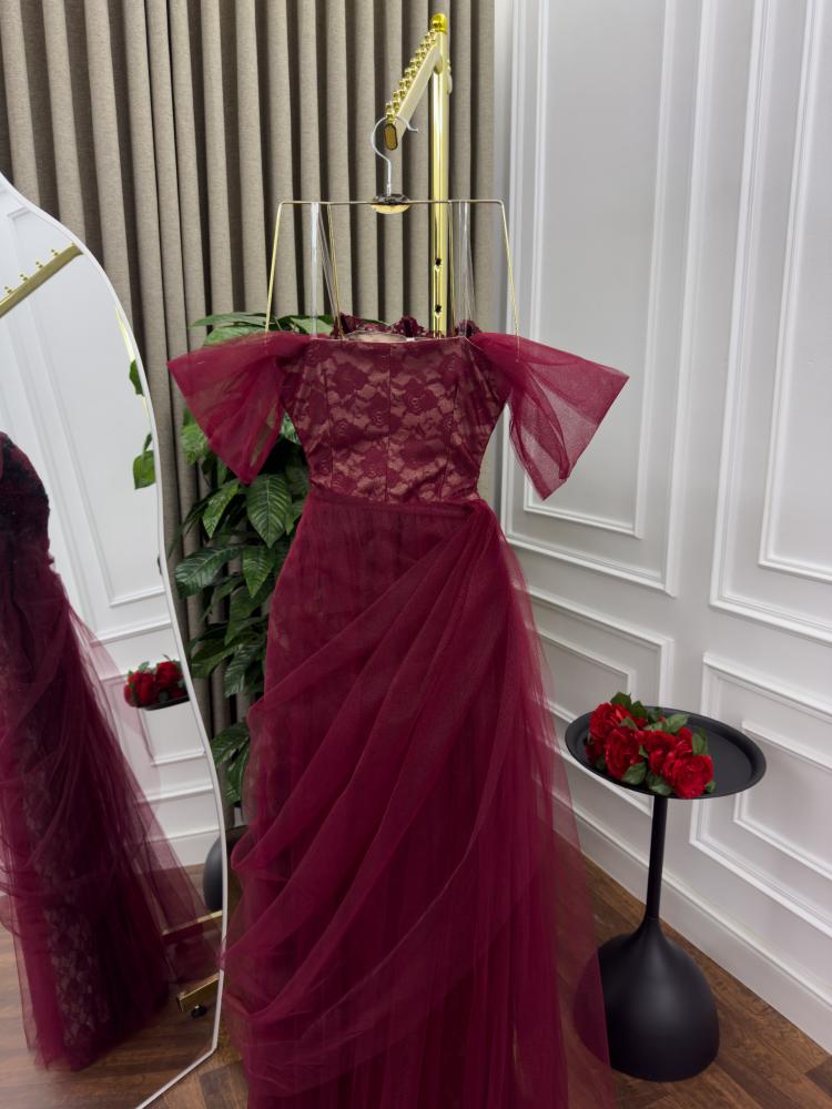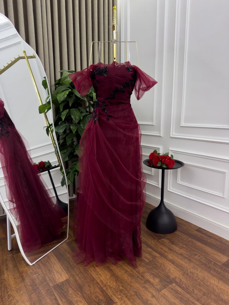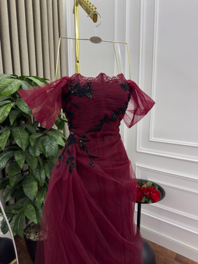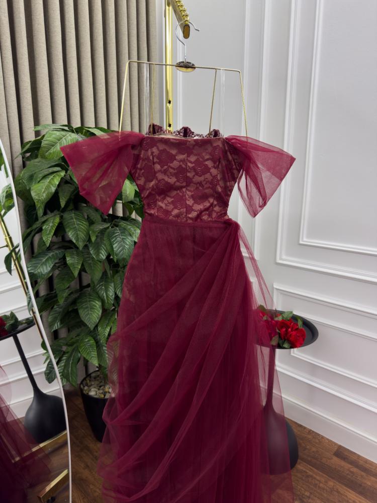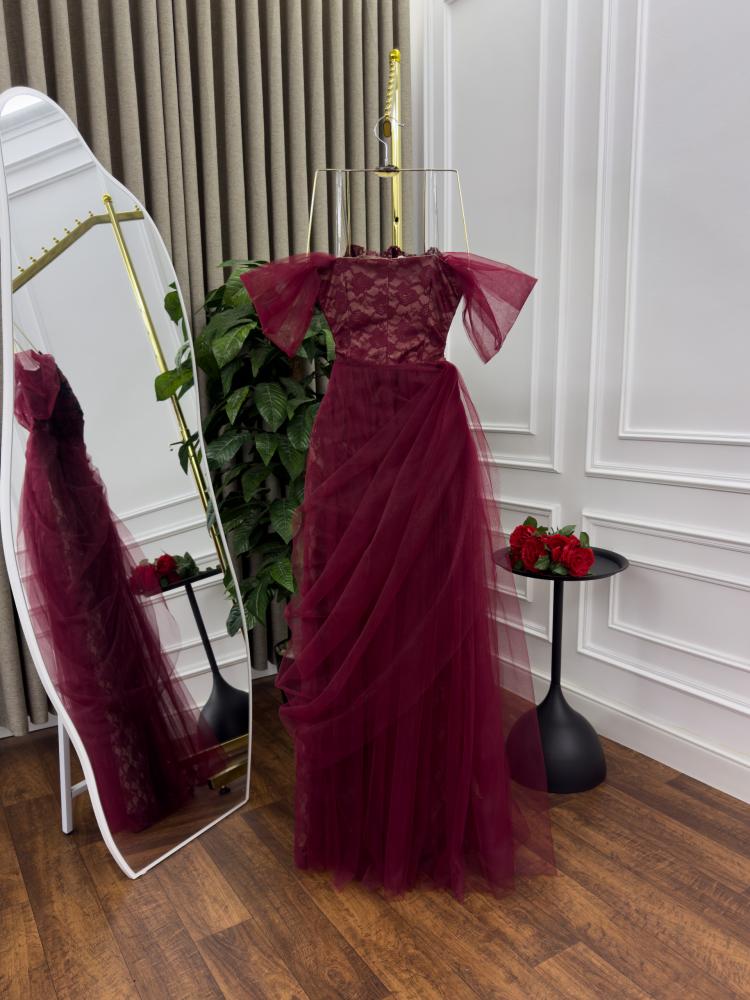 فستان سهره اللون عودي خامه تل ودانتيل وتطريز يدوي MN