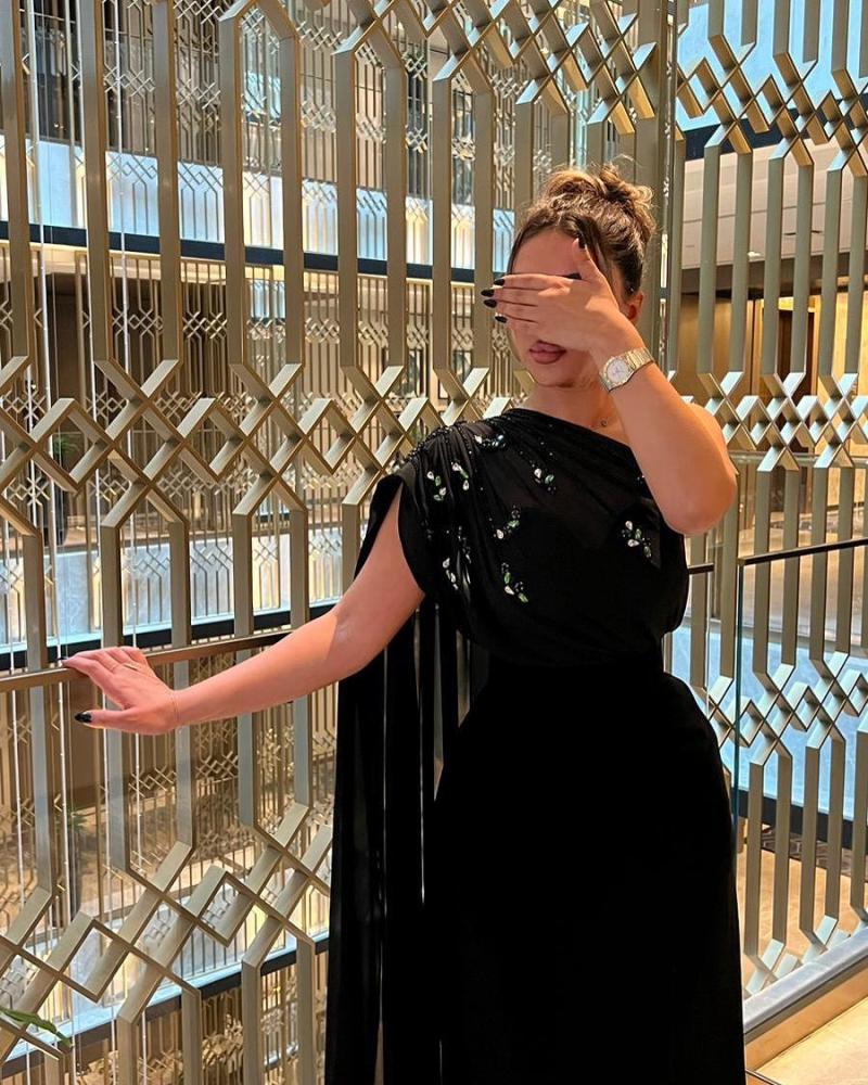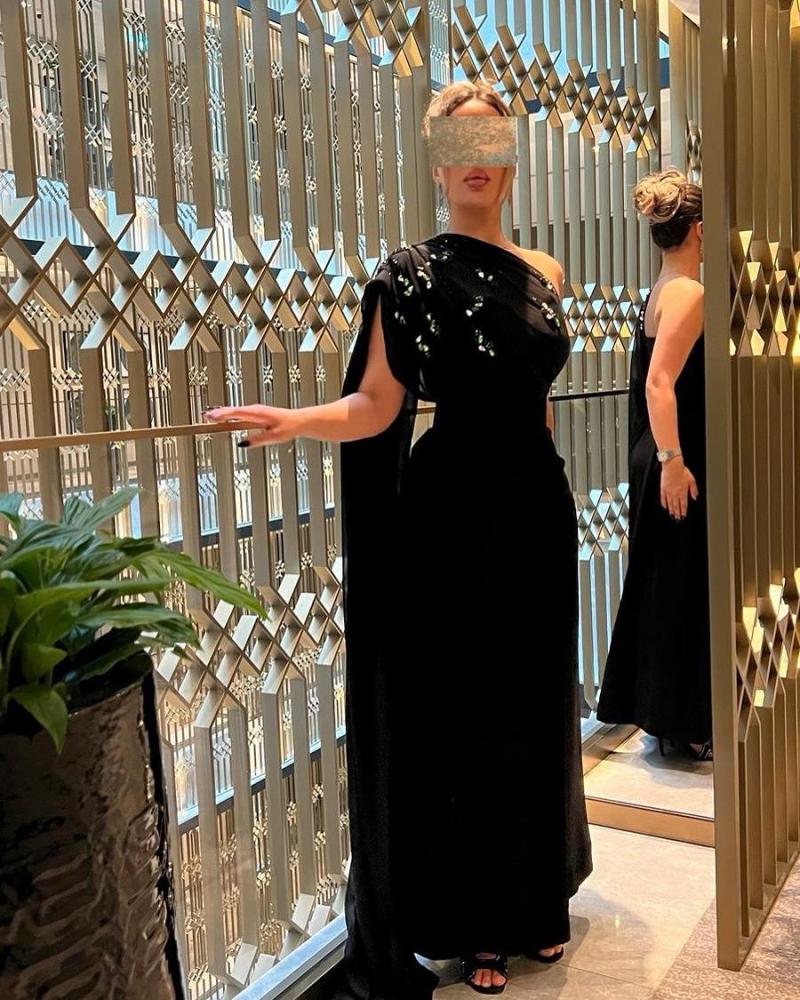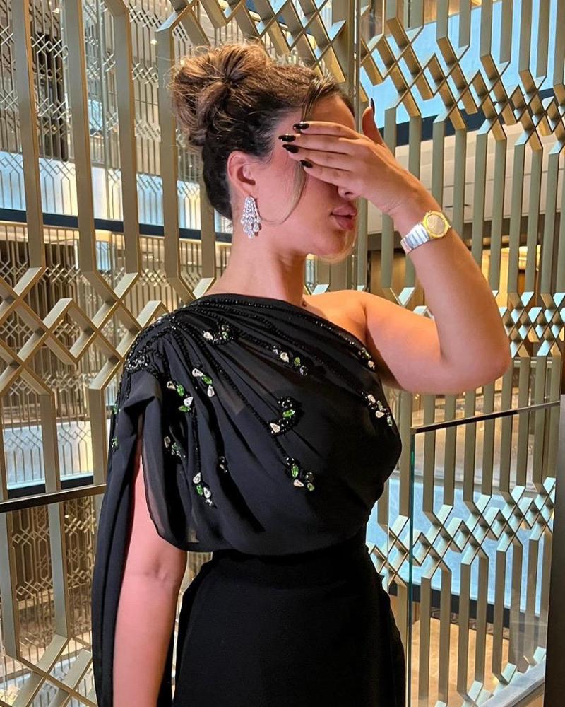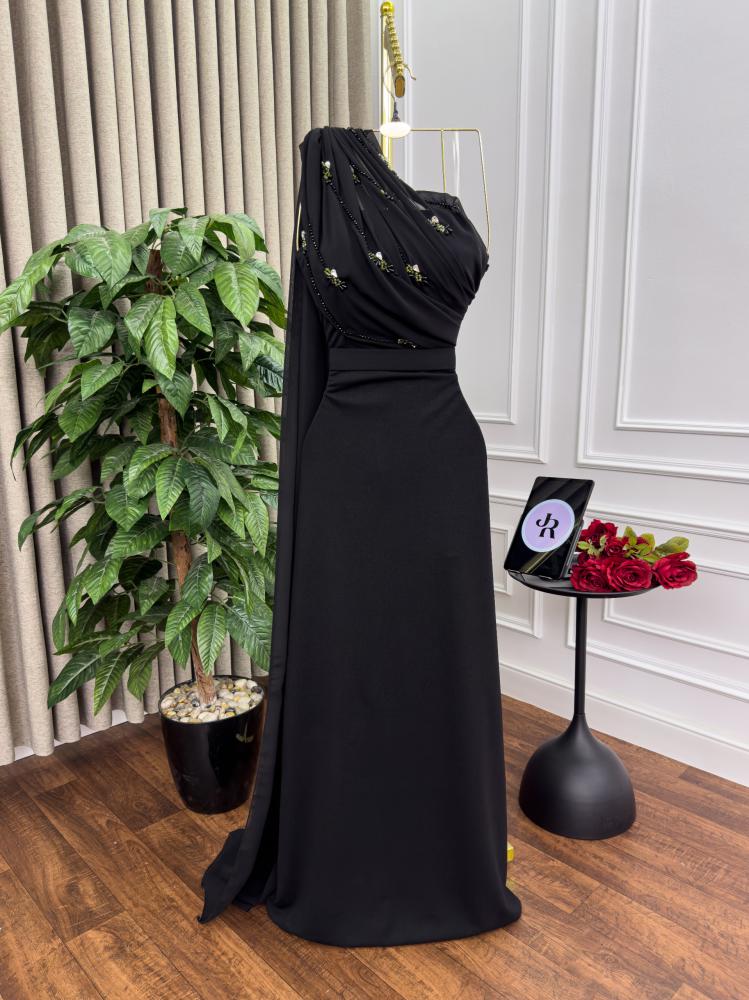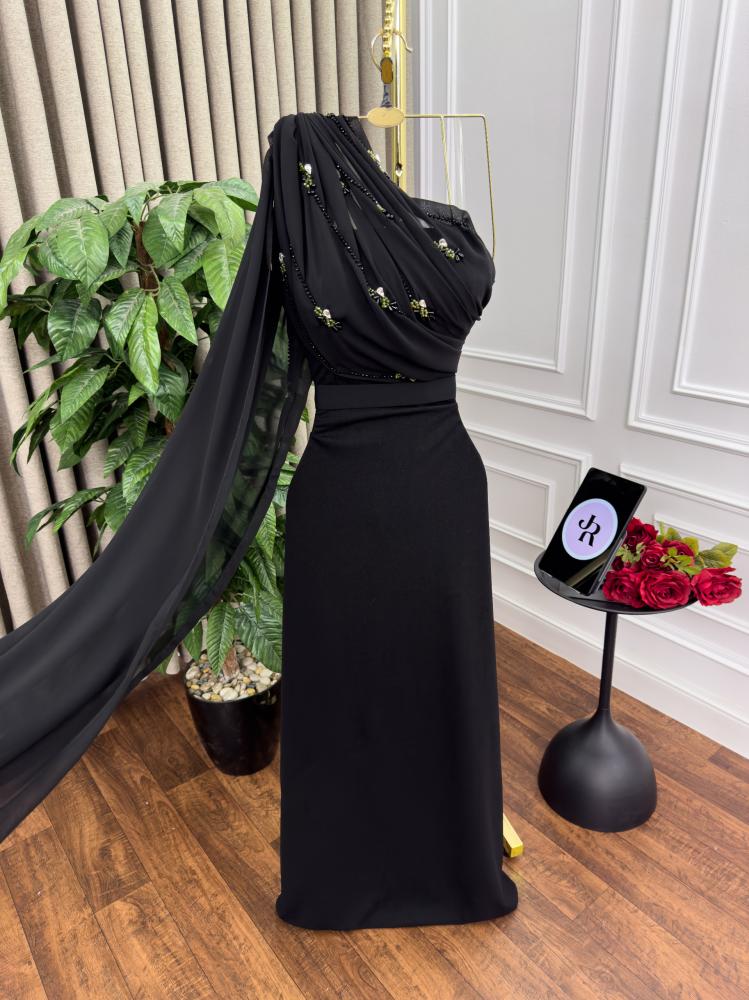 فستان اسود مطرز من الصدر بالخرز و خامه الفستان باربي مع شال من الشيفون من متجر جوهره