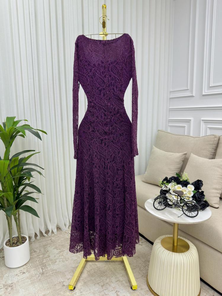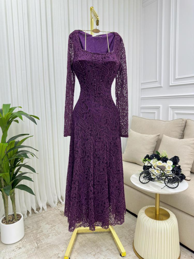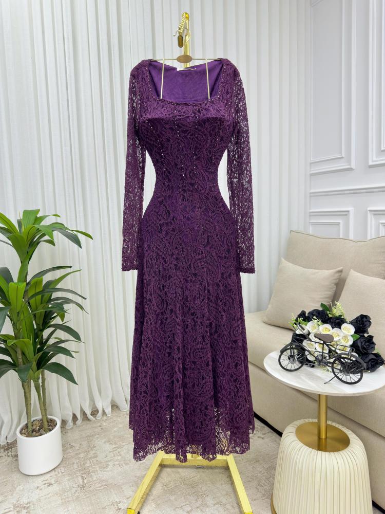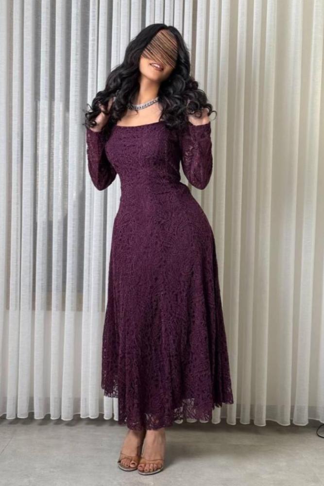 فستان ميدي دانتيل مزين بستراس لمعه اللون سكري AR