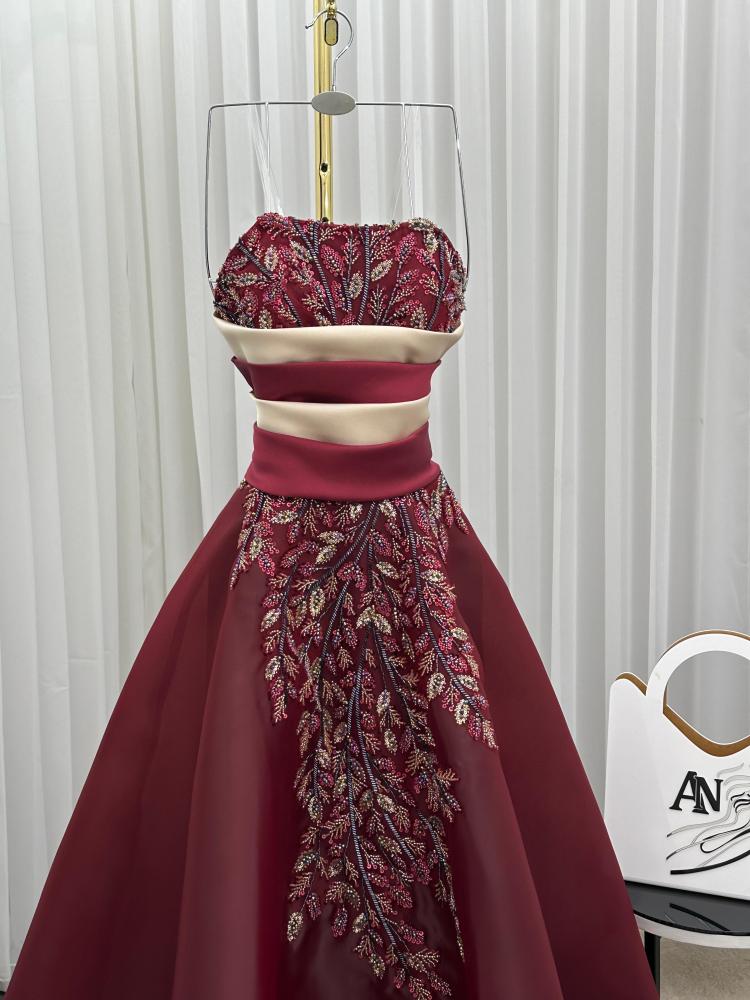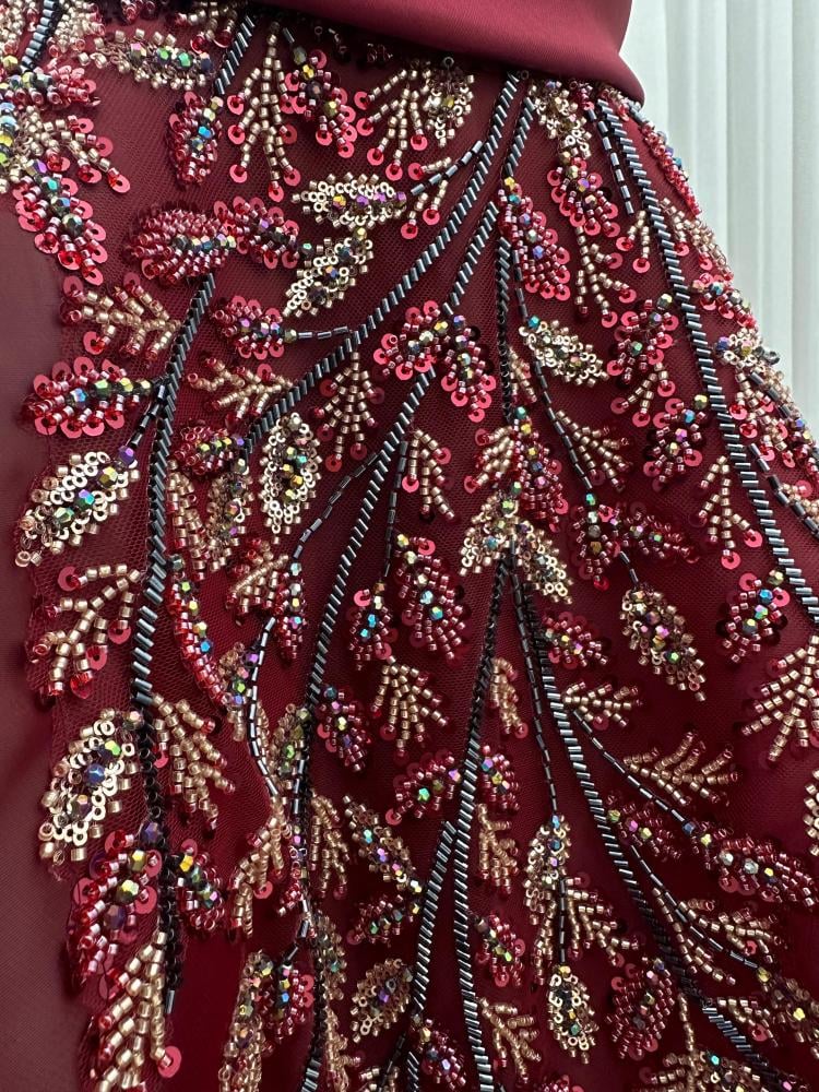 فستان سـهرة اللون برغندي الخامة جزار تطريز خرز راقي من متجر جوهرهAN
