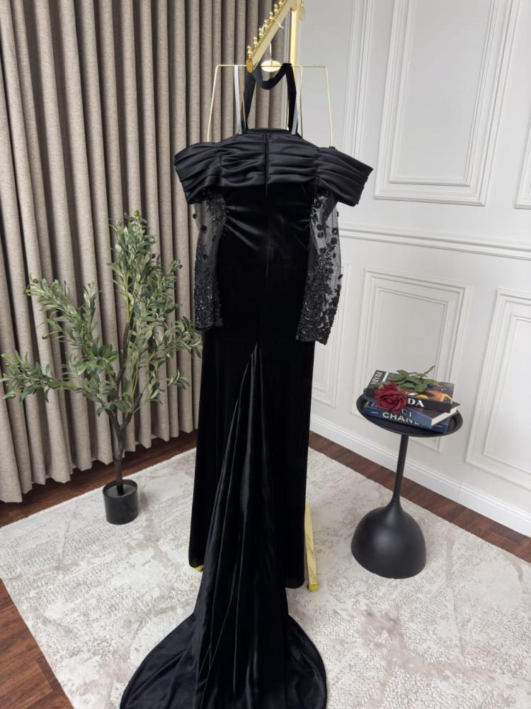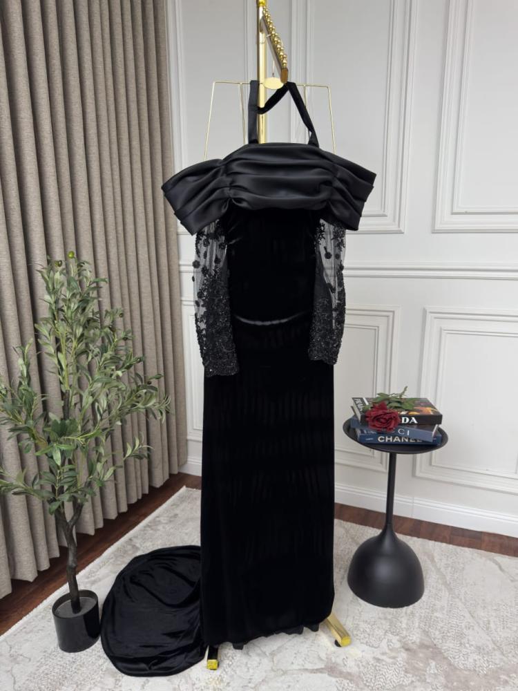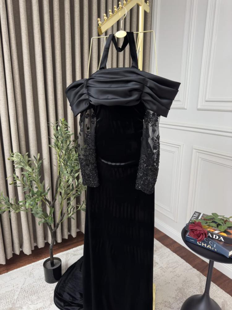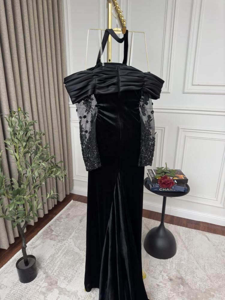 فستان اسود القماش مخمل كوري اصلي درجه اولى تفته استرتش بأكمام دانتيل سهره TR