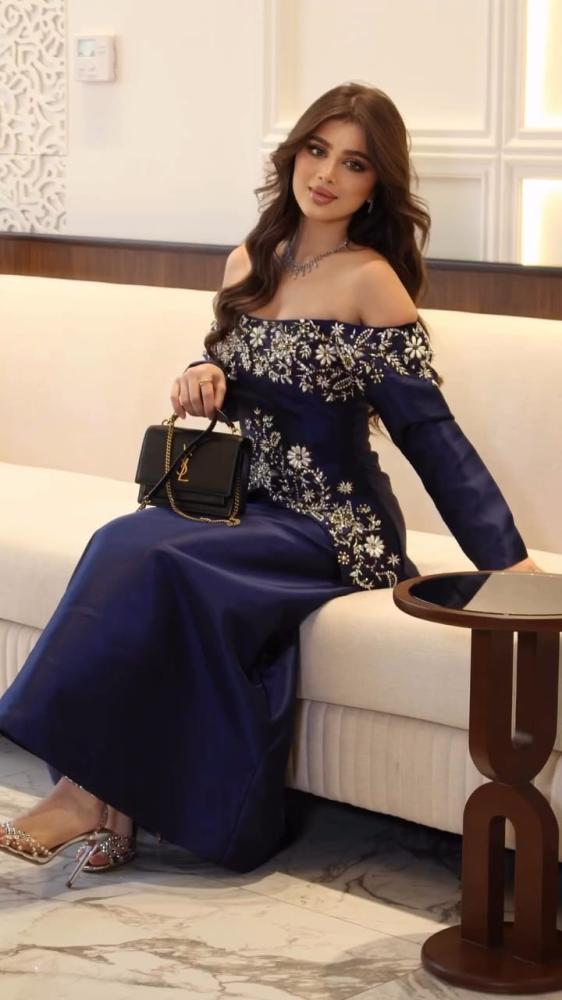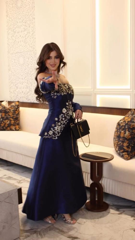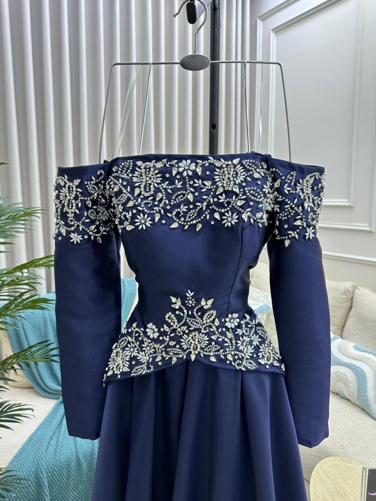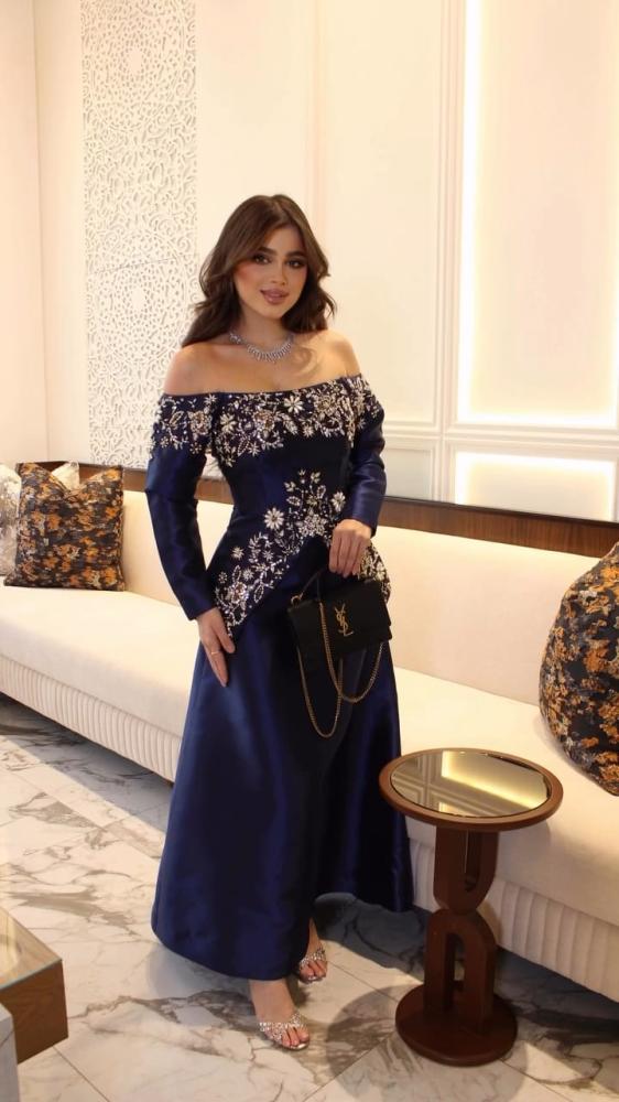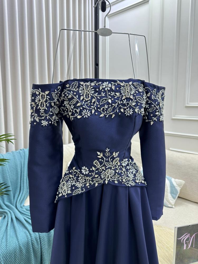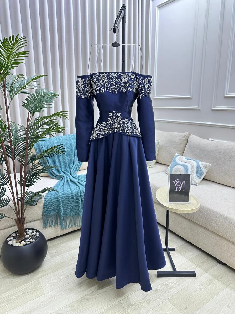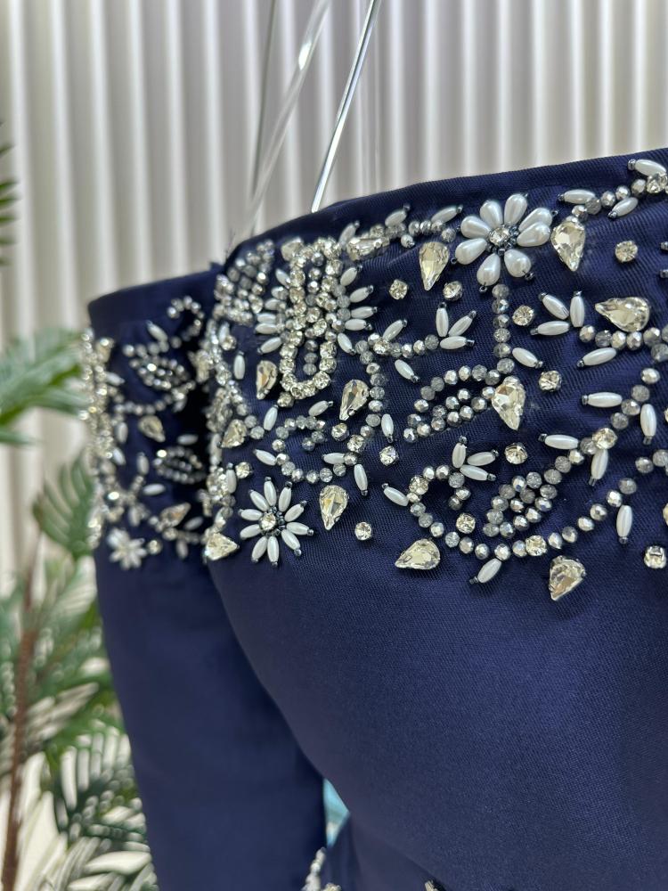 فستان سهره اللون كحلي الخامه ميكادو تطريز يدوي بالقماش من متجر جوهره MA