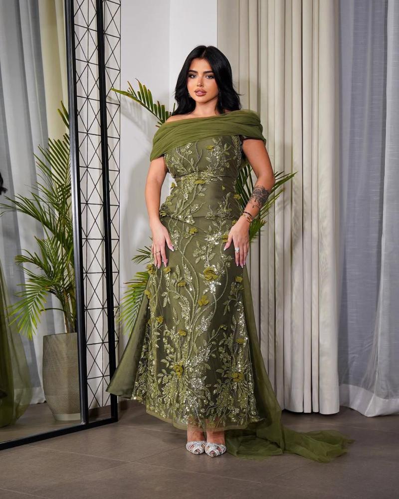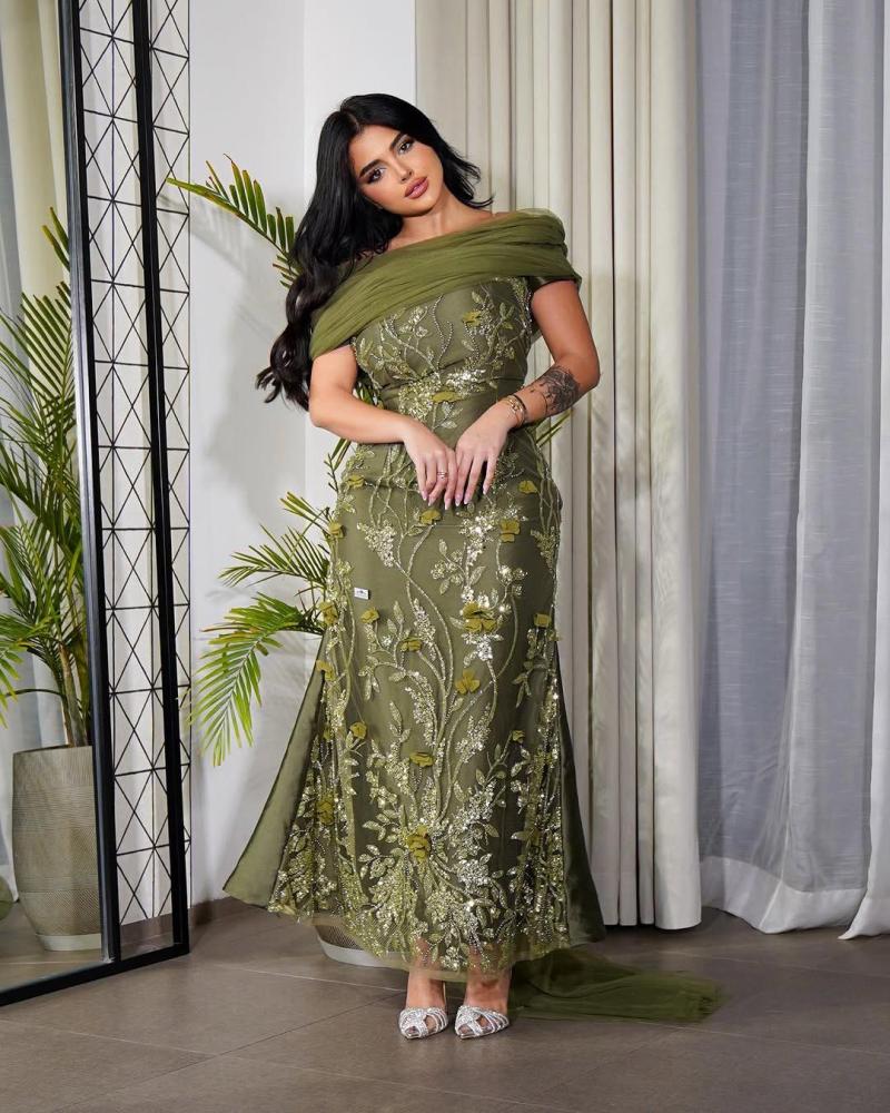 فستان سهره اللون زيتي خامه تل وورد بارز وميكادو MN