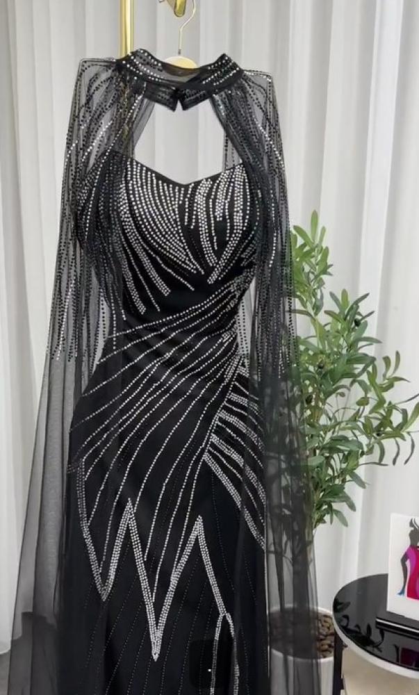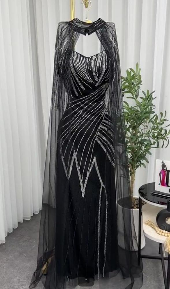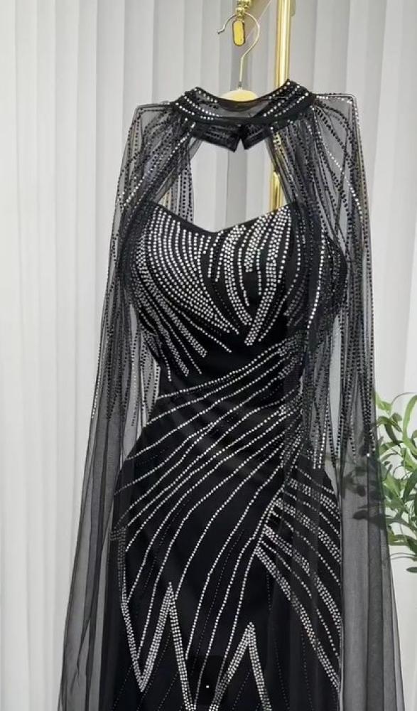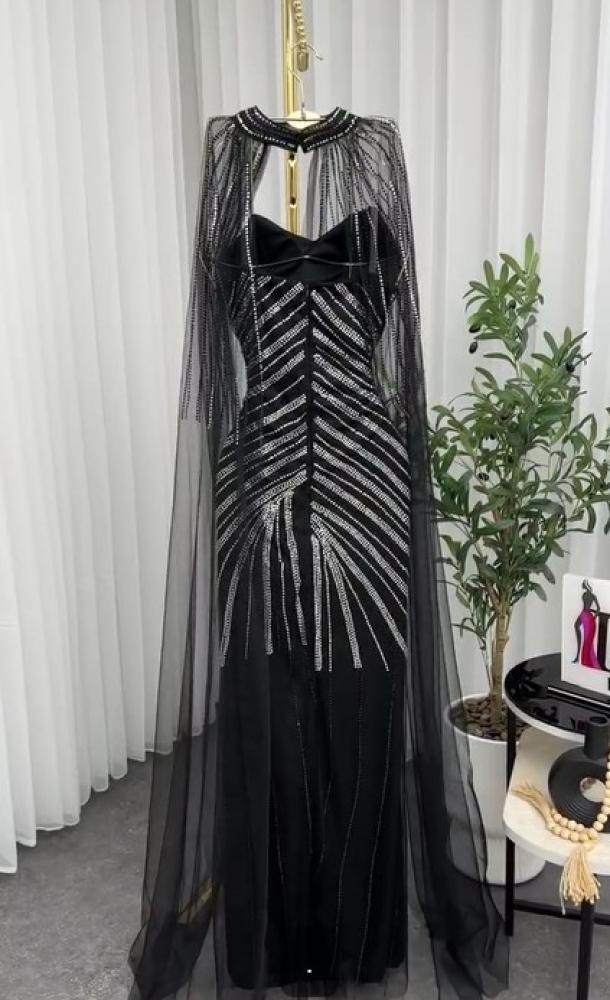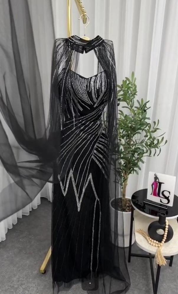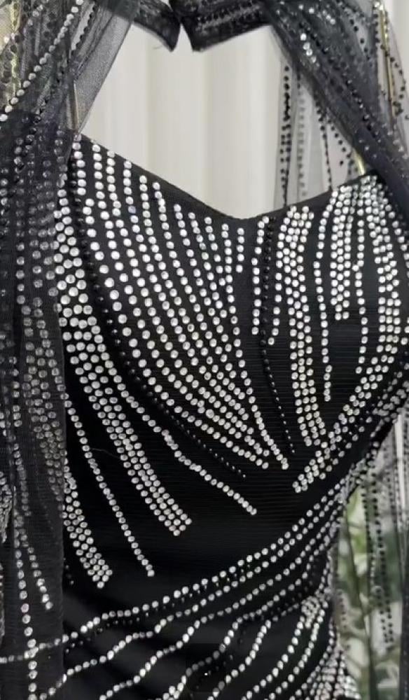 فستان فخم اللون اسود الخامه لبانه استرتش مغطى بتل مطرز LS