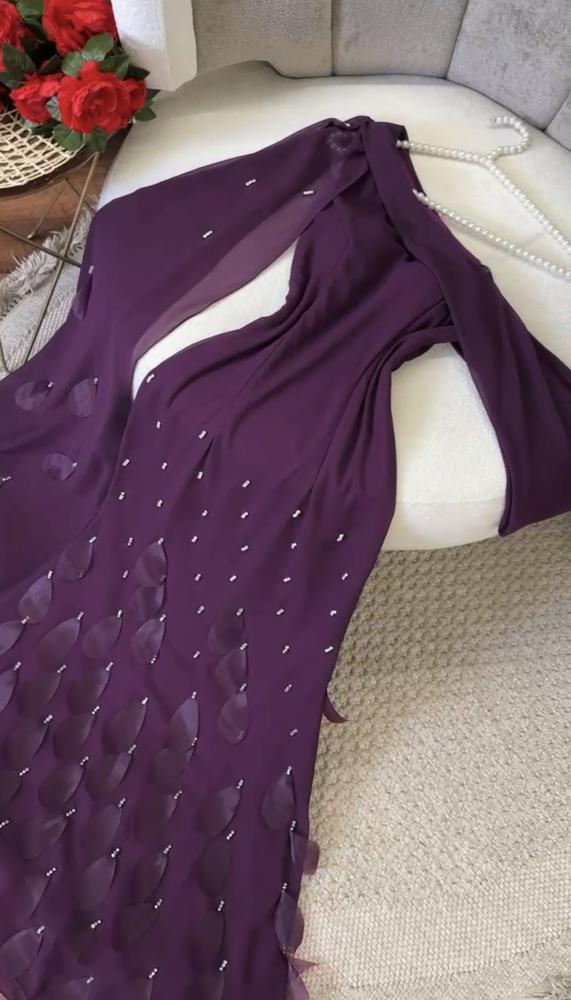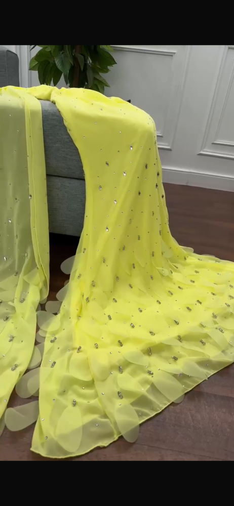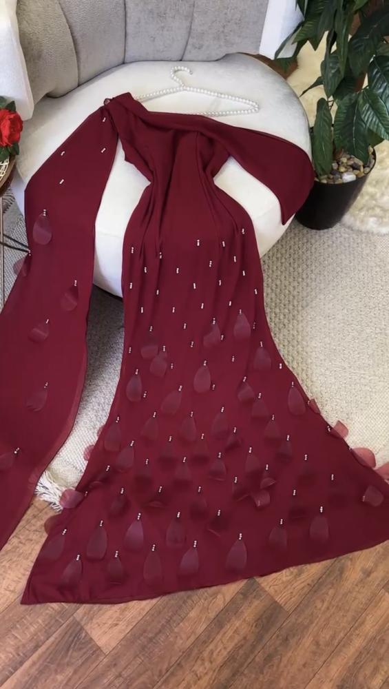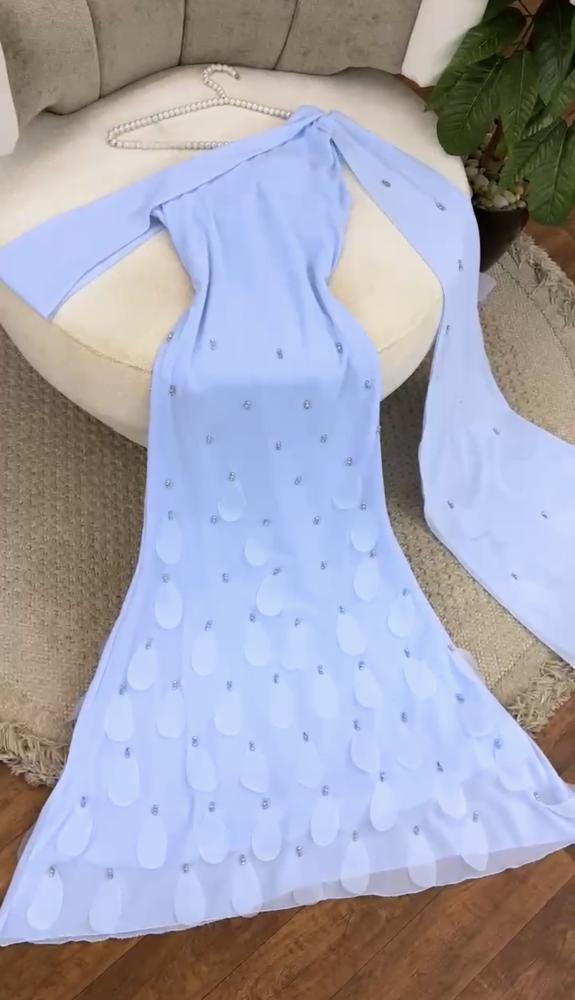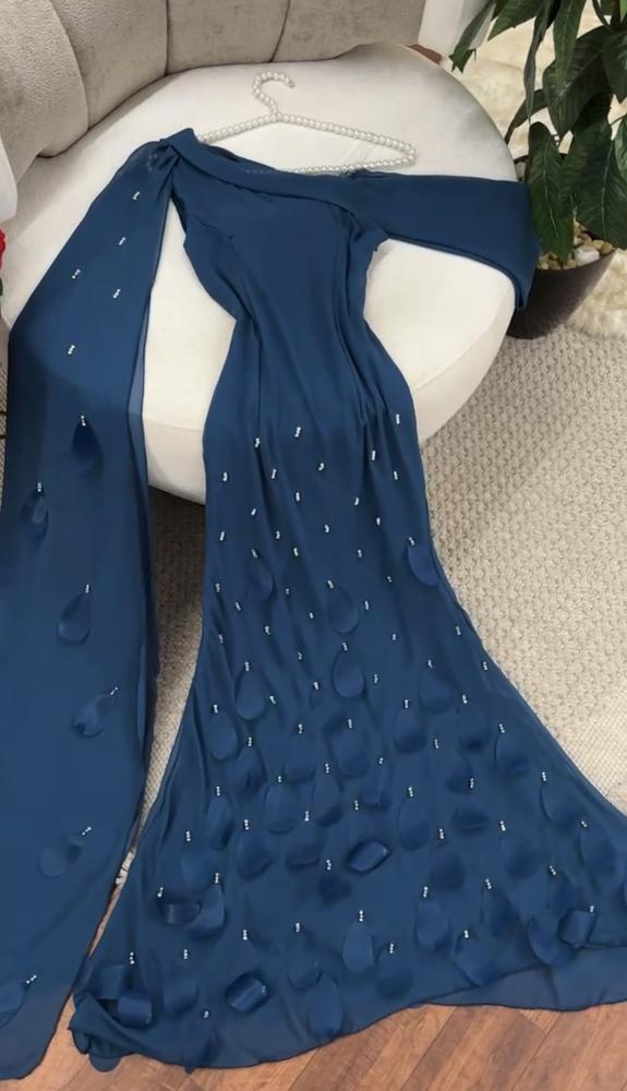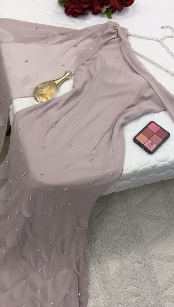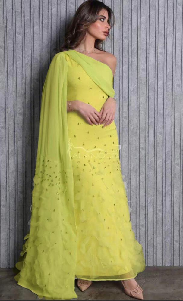 التصميم : فستان شيفون ناعم مطرز و شال مطرز يدويا يغطي نصف الكتف بالوان مختلفه و مميزه