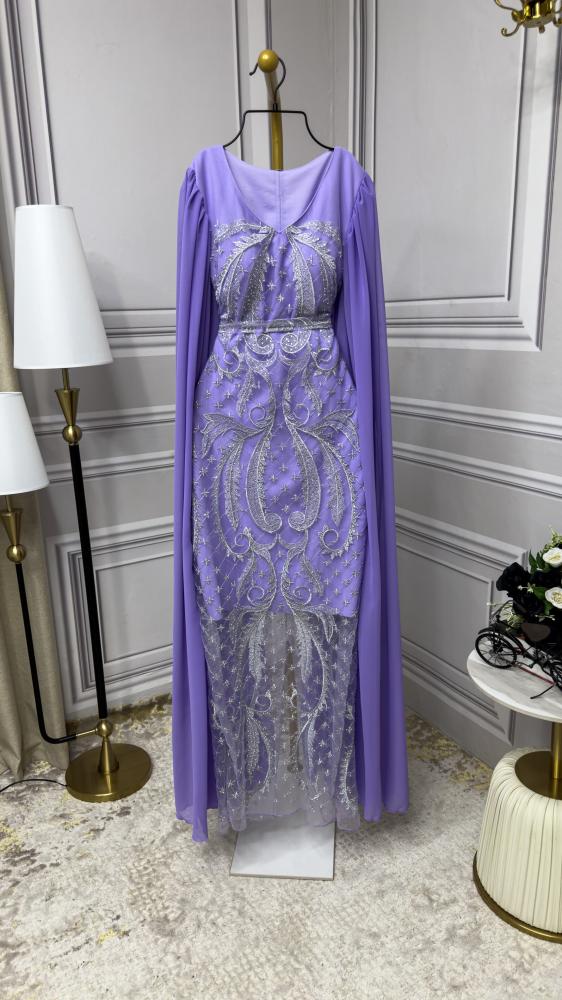 فستان سهره اللون موف القماش تل مطرز كمبيوتر وفصوص شيفون AR