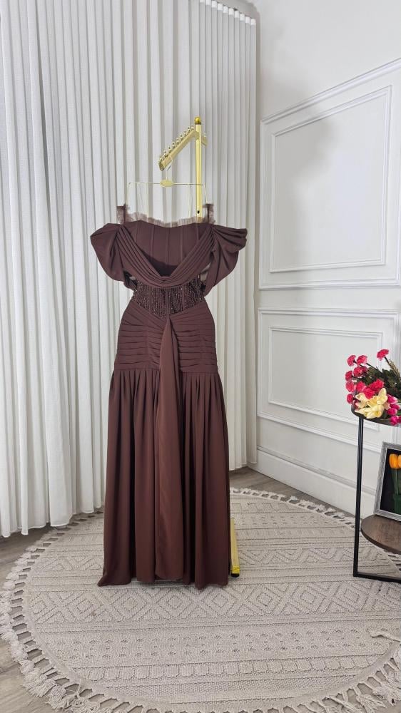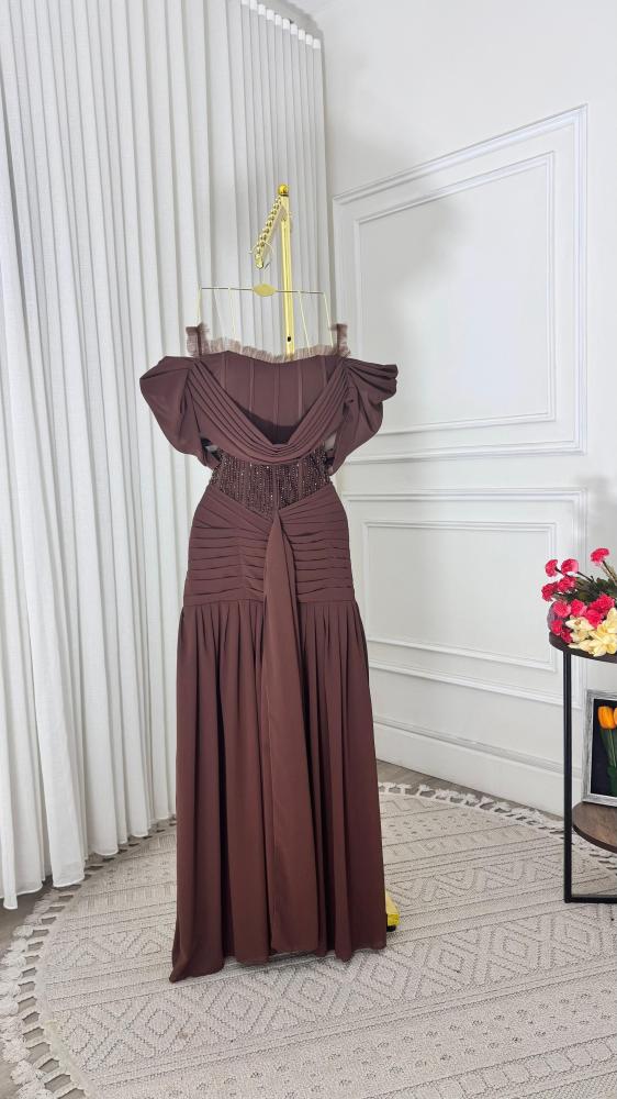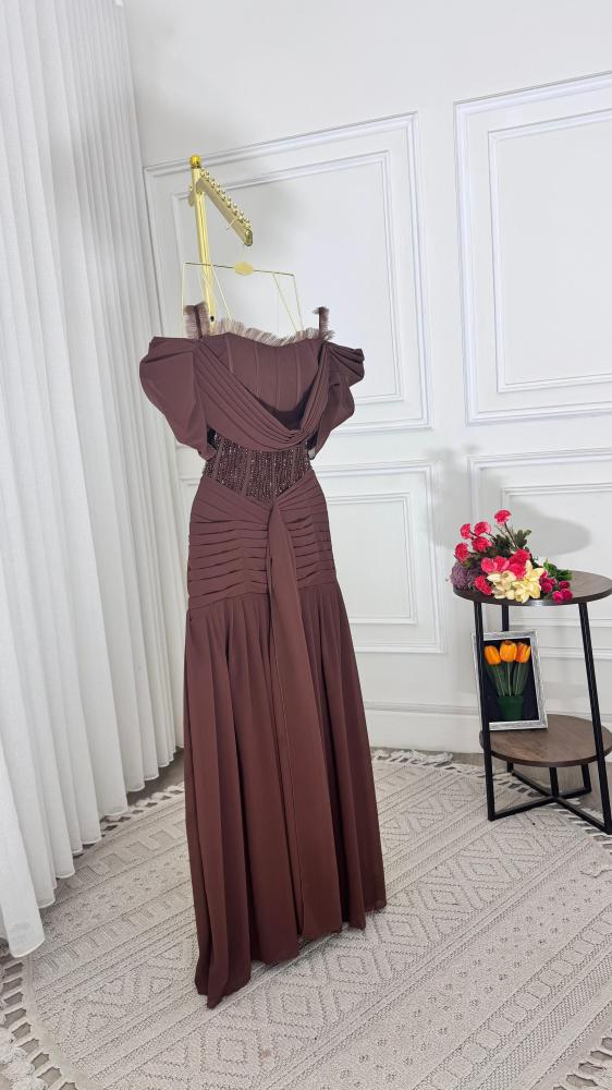فستان سهره اللون بني شيفون جورجيت تطريز يدوي كرستال من متجر جوهره FD