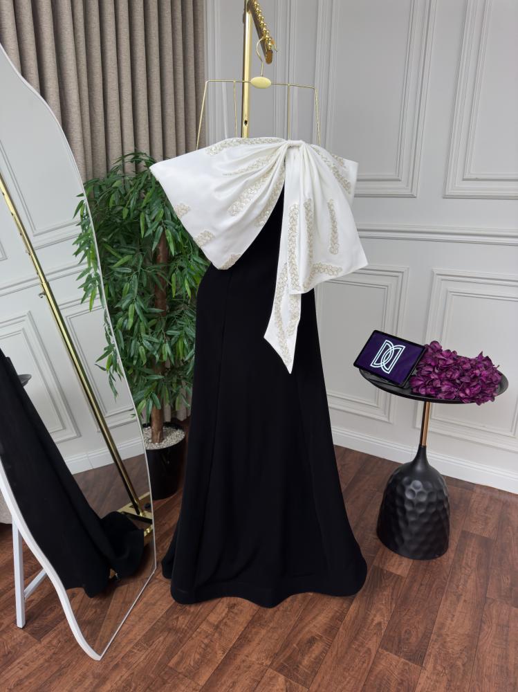 التصميم : فستان سهره بتصميم فيونكه من التوب باللون الابيض مع التطريز المذهب و كلوش من الاسفل باللون الاسود يعطي اطلاله ناعمه وراقيه