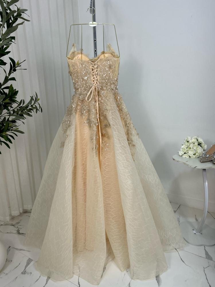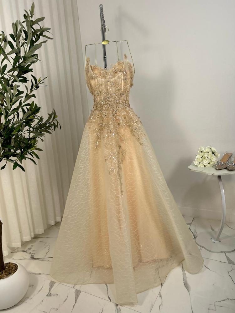 فستان سهره اللون بيج وشبك تحت وجيبون وورد بارز وبطانه باربي MN