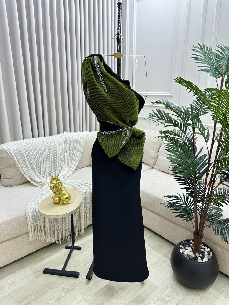 فستان ناعم اللالوان زيتي وعودي باربي اصلي درجه اولى مع كرنكل الخامه الاصليه بتطريز يدوي راقي وكسرات بليسيه TR