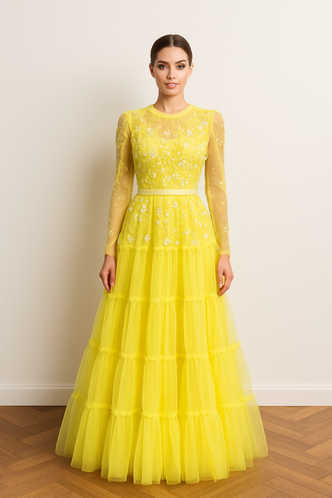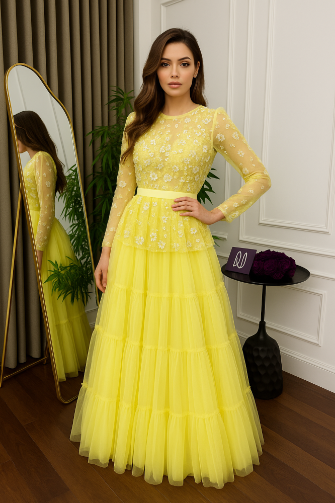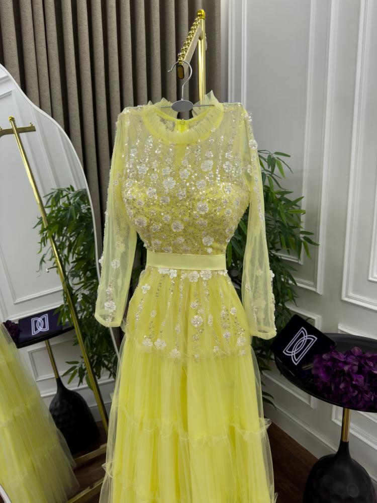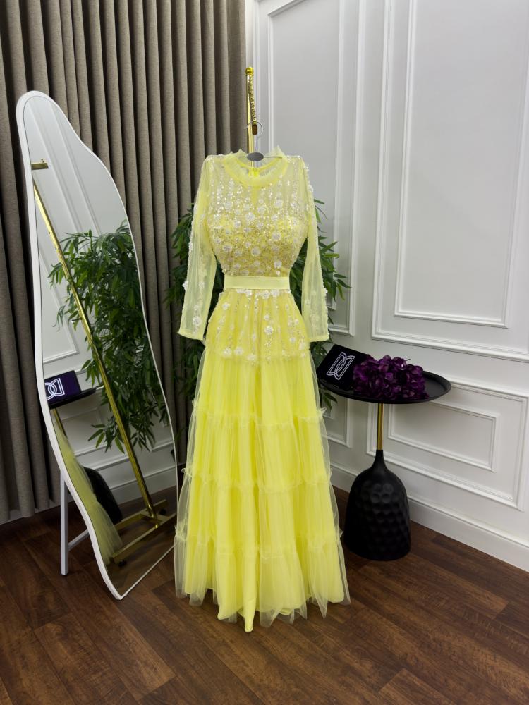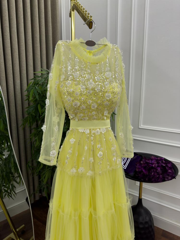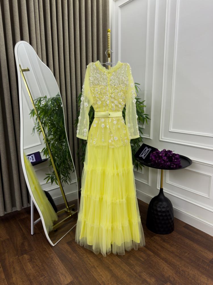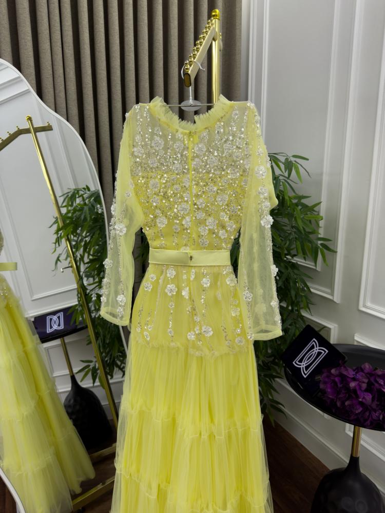 فستان سهره اللون اصفر تل كلفه تطريز مورده من متجر جوهره D