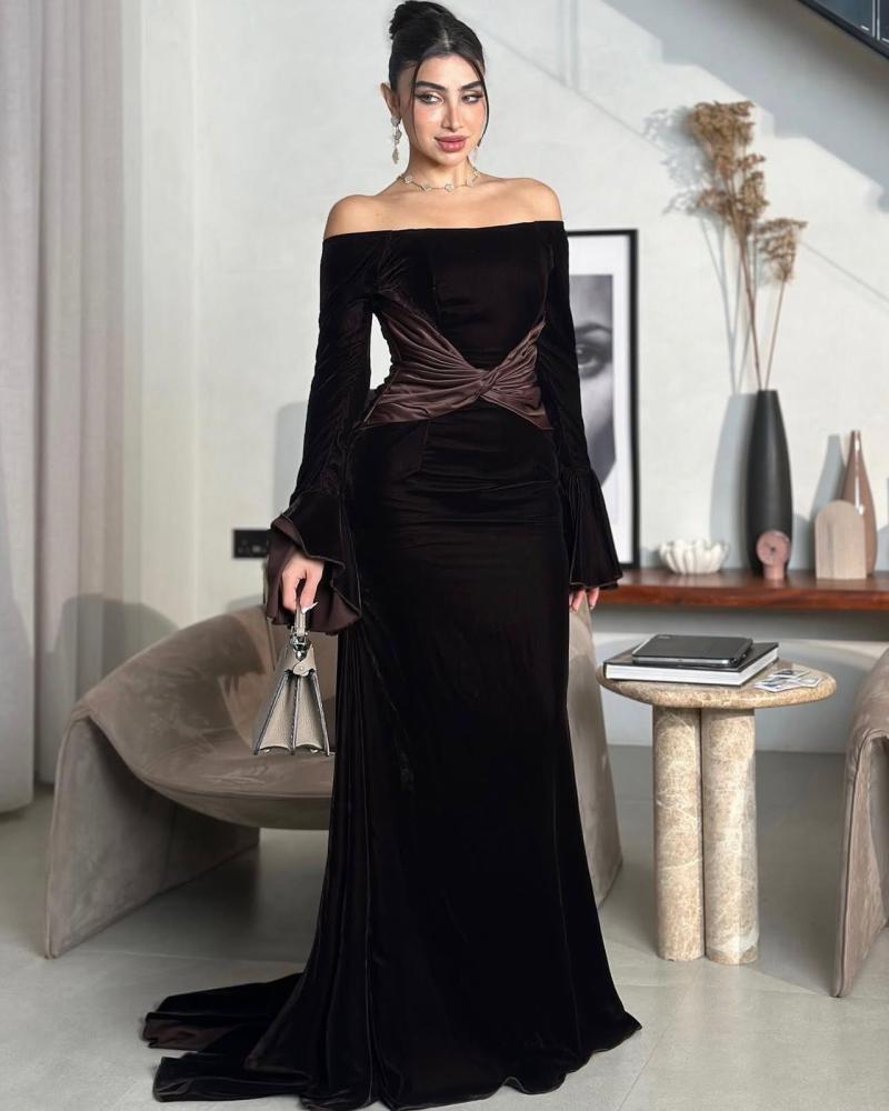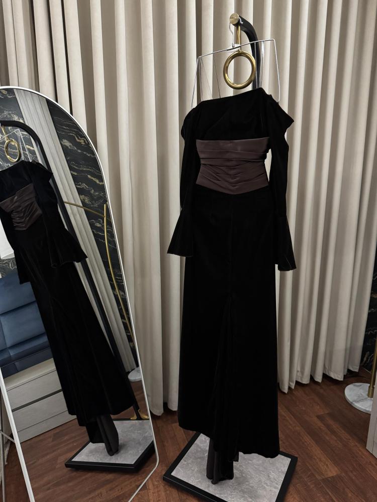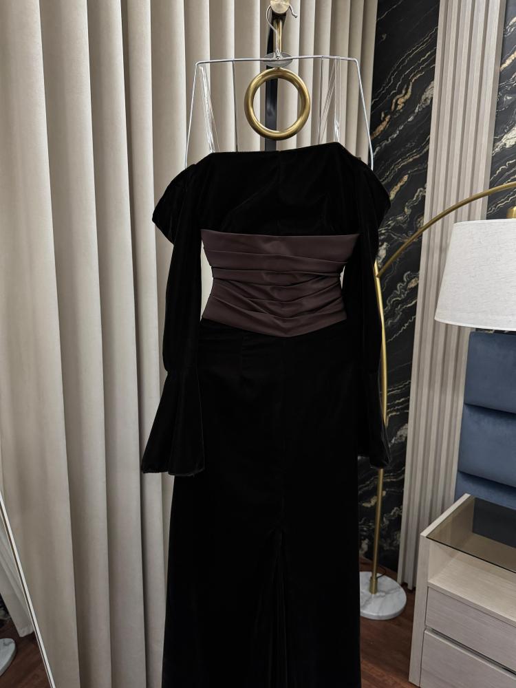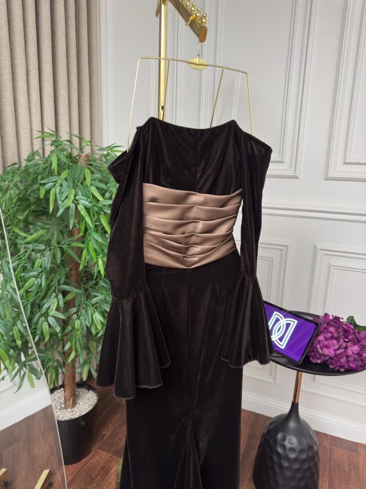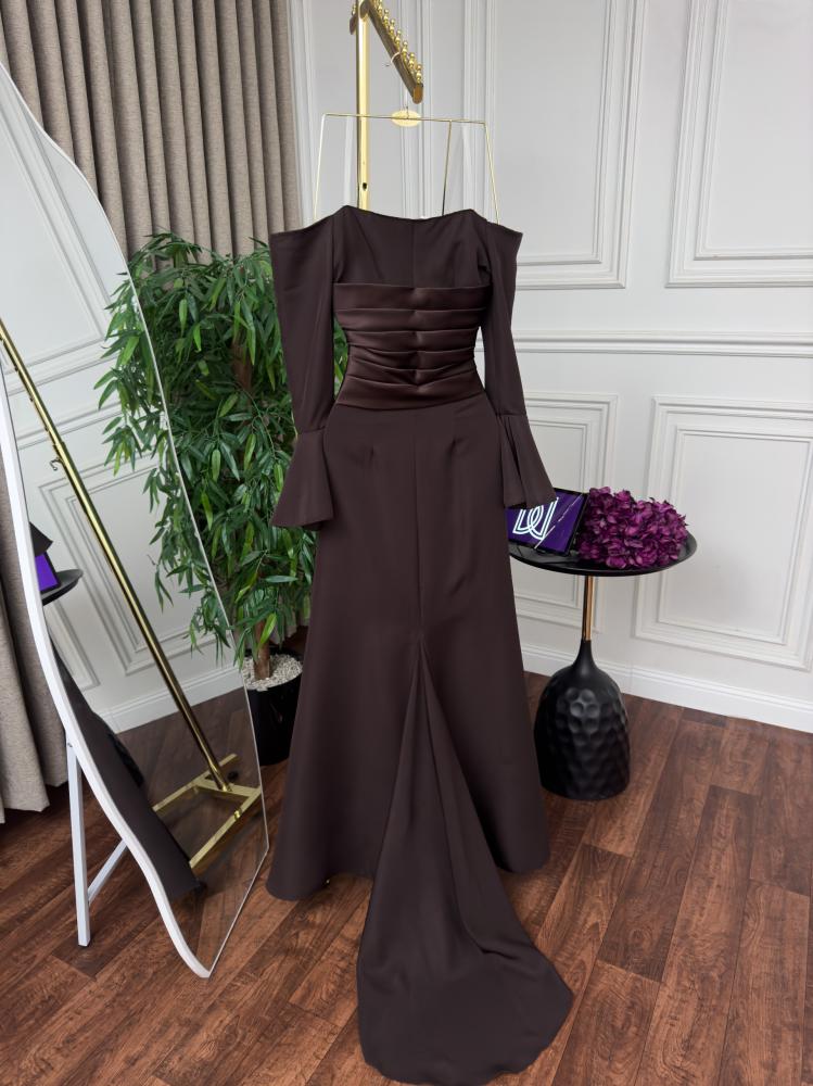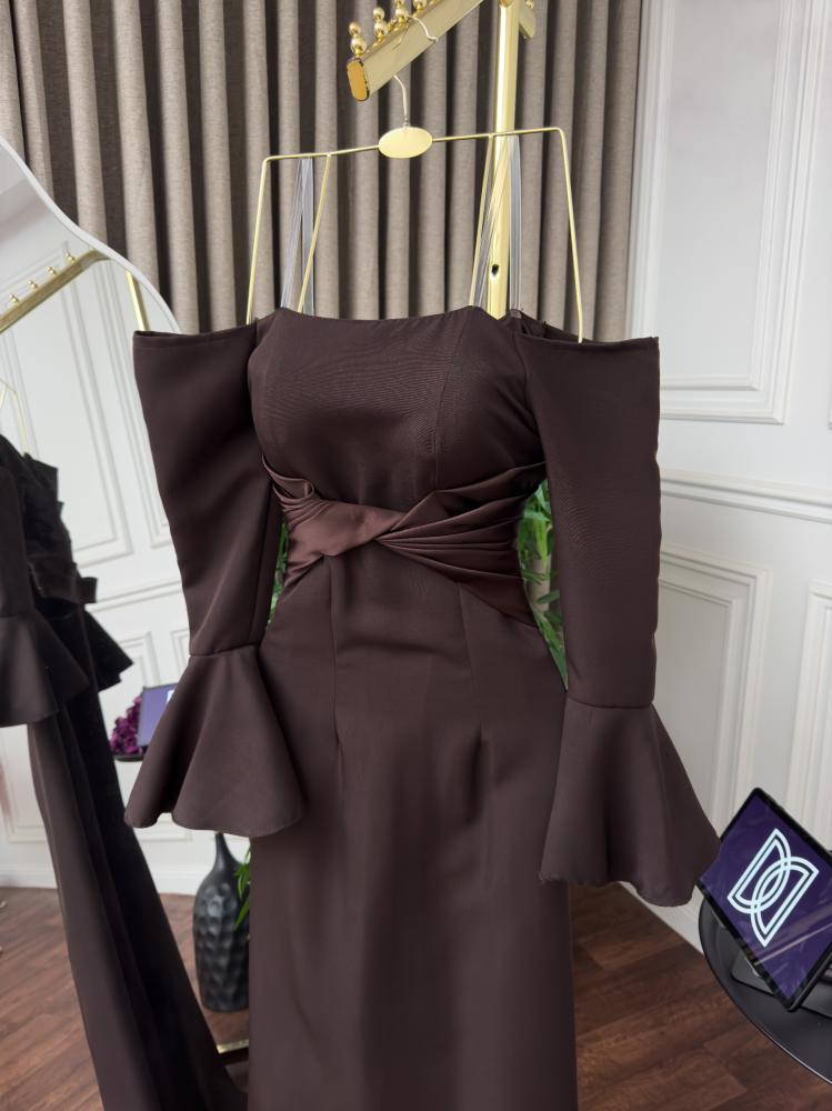 التصميم : فستان ناعم بني اوف شولدر اكمام طويله فرنسيه مع ربطه على الخصر على شكل طيات متجانسه فستان طويله لمناسبات خاصه او رسميه